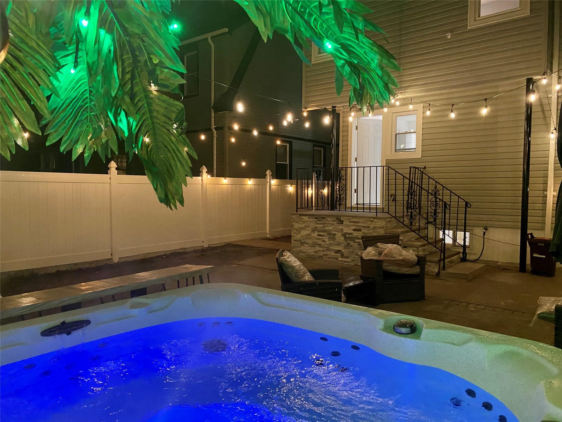 - Pool at twilight featuring fence, an outdoor hot tub, and a patio