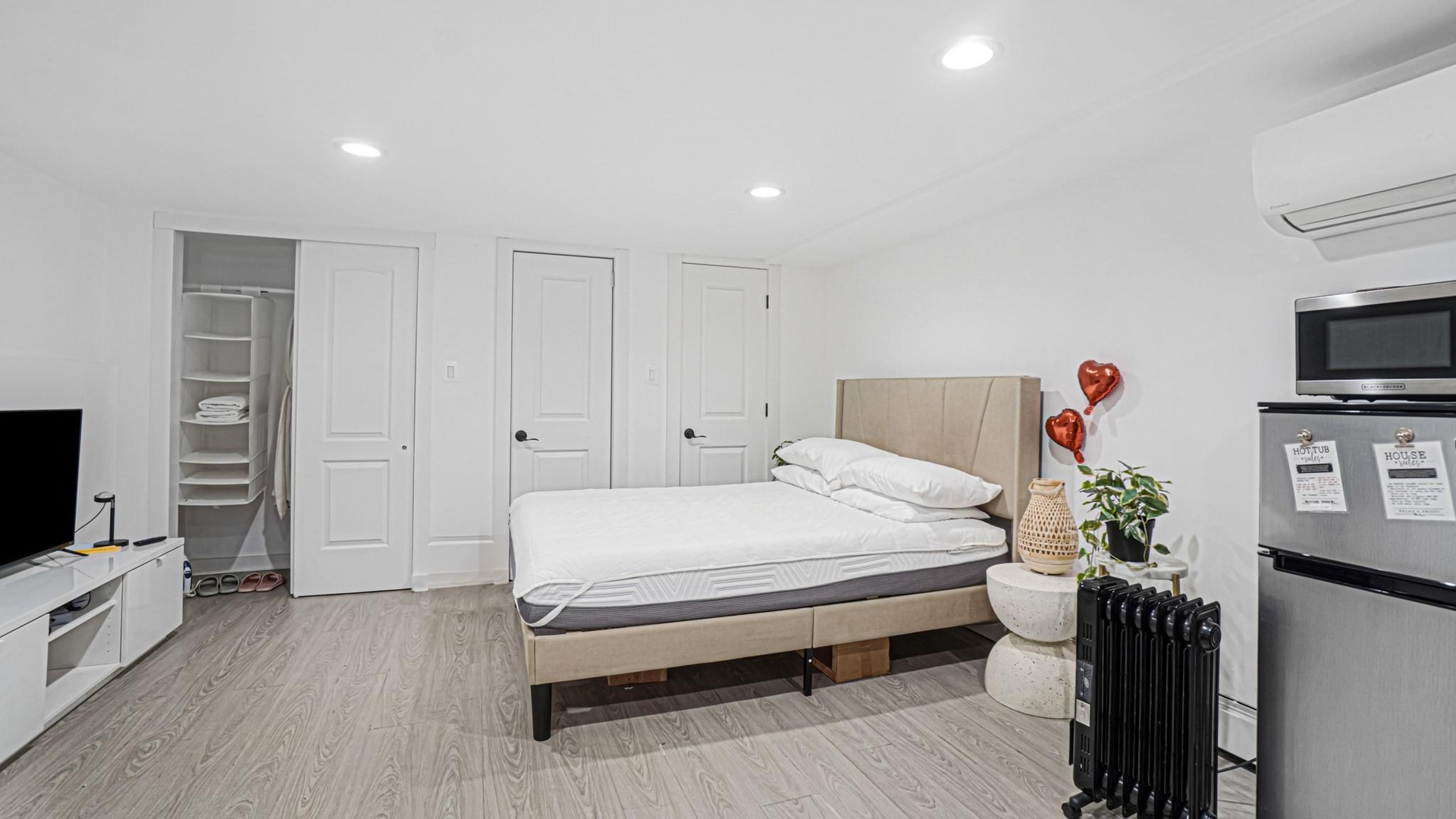- Bedroom featuring a wall mounted AC, recessed lighting, light wood-style floors, and freestanding refrigerator