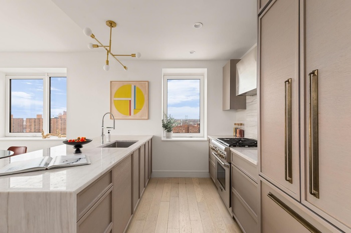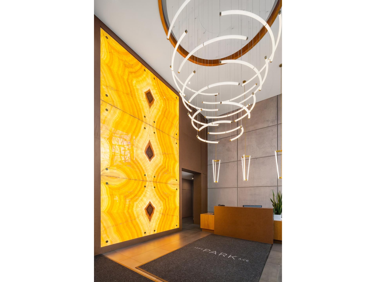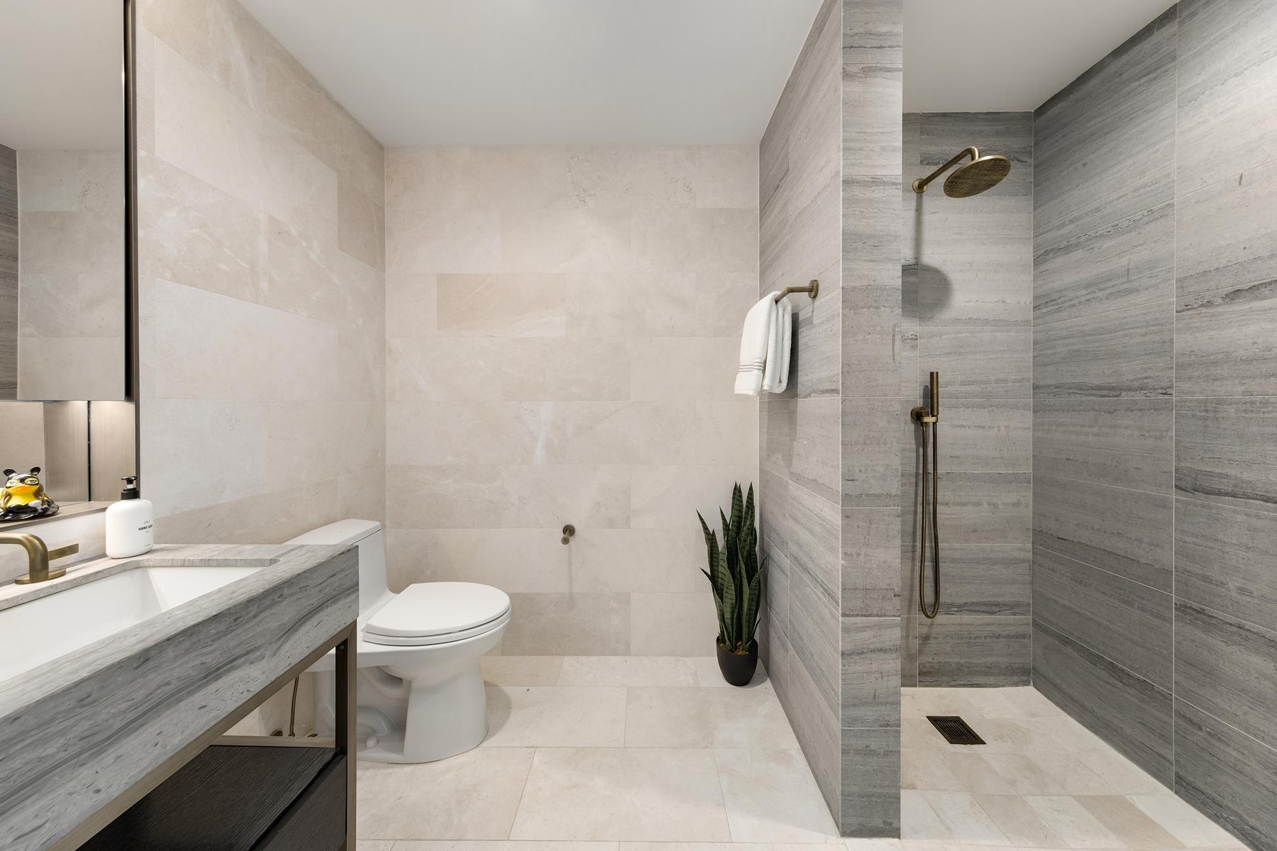 A grand foyer leads to the expansive primary suite, featuring a wall of windows, an oversized walk-in closet, and a spa-like ensuite bath with a double vanity and deep walk-in shower. The open-concept living and dining area is bathed in natural light-perfect for both entertaining and everyday living. The chef's kitchen is beautifully appointed with marble countertops, a Thermador range, and custom oak cabinetry with integrated Bosch appliances. The southern wing offers three spacious bedrooms, all with deep closets. Two share a stylish full bath with honed marble walls and a soaking tub, while the corner fourth bedroom boasts an ensuite bath with marble and limestone finishes. Wide-plank oak floors, central air, sound-attenuated windows, an in-unit Bosch washer/dryer, and a dedicated parking space complete this exceptional offering.