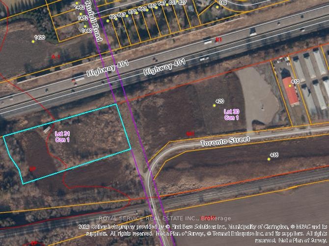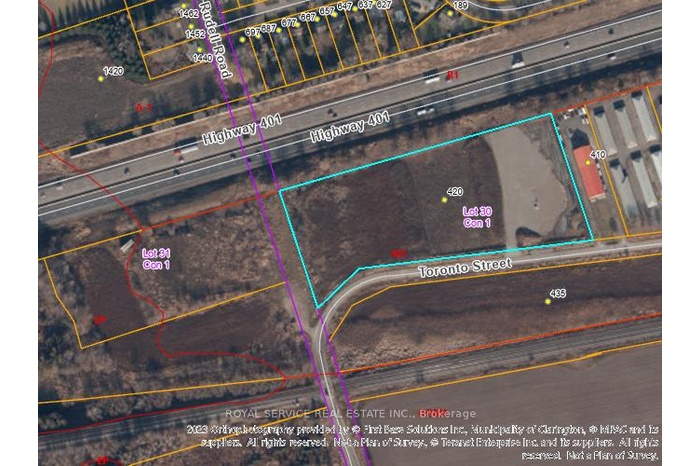 6.8-acres of vacant M1-Industrial land with 880 feet frontage/exposure to Highway 401 immediately west of Hwy 401 Interchange #440 at Mill Street/Newcastle. Legal Description: PT LT 30 CON 1 CLARKE PTS 2, 3 & 4, 10R2937; CLARINGTON. PIN 266610056. Examples of permitted uses within M1-Industrial zoned lands: building supply or home improvement outlet; business or professional office; eating establishment; equipment sales & rental light; a factory outlet; commercial or technical school; a warehouse for the storage of goods & materials; motor vehicle repair garage; a transport service establishment. See attached Schedule for complete list of M1-Industrial permitted uses. DO NOT GO DIRECT. All appointments must be made thru BrokerBay. Buyer/Buyer Agent responsible for completing own due diligence.
