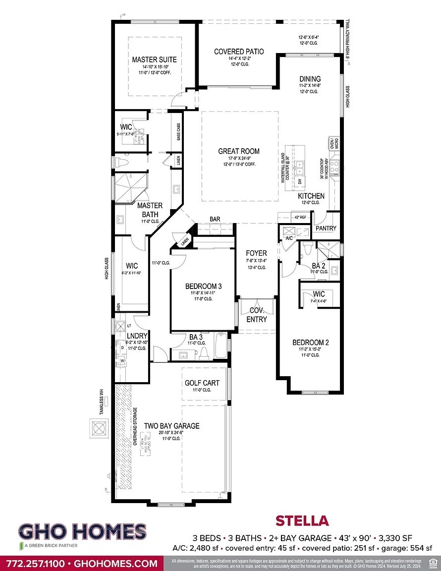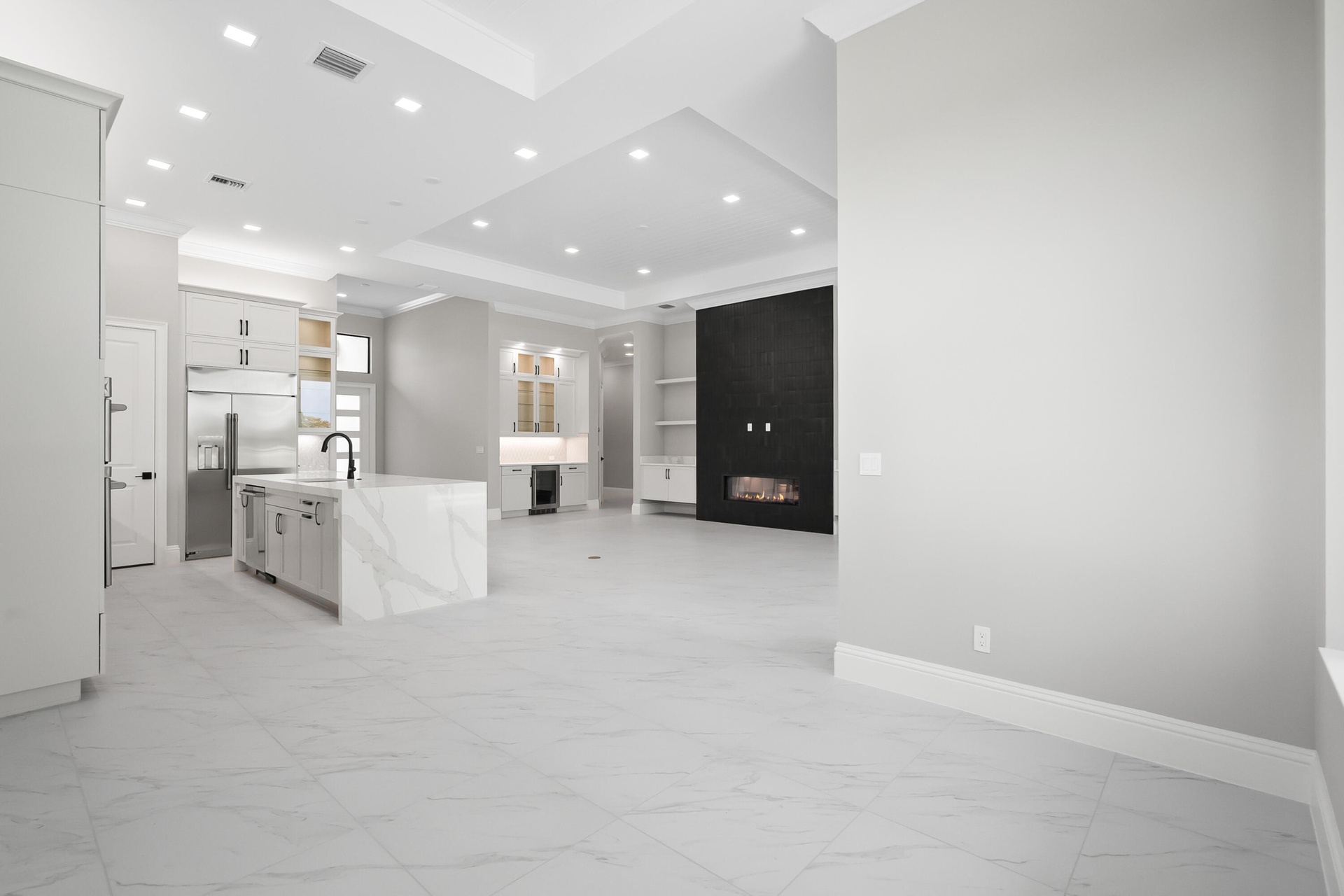 Located in the prestigious Tesoro Club, this exceptional residence features a striking contemporary front elevation. Based on the Stella model, this residence boasts impressive high-volume ceilings and a chef's kitchen with top-of-the-line Cafe appliances, including a spacious 42-inch built-in refrigerator. The kitchen is designed for functionality and style, featuring an oversized central island with a stunning 2.5-inch waterfall edge, a walk-in pantry with custom shelving, and stacked cabinets above a natural gas cooktop. The great room is a focal point, enhanced by an electric fireplace surrounded by elegant tiling, creating an inviting and sophisticated atmosphere. The backyard is perfect for entertaining, with a luxurious pool and travertine paver patio that elevates outdoor living!