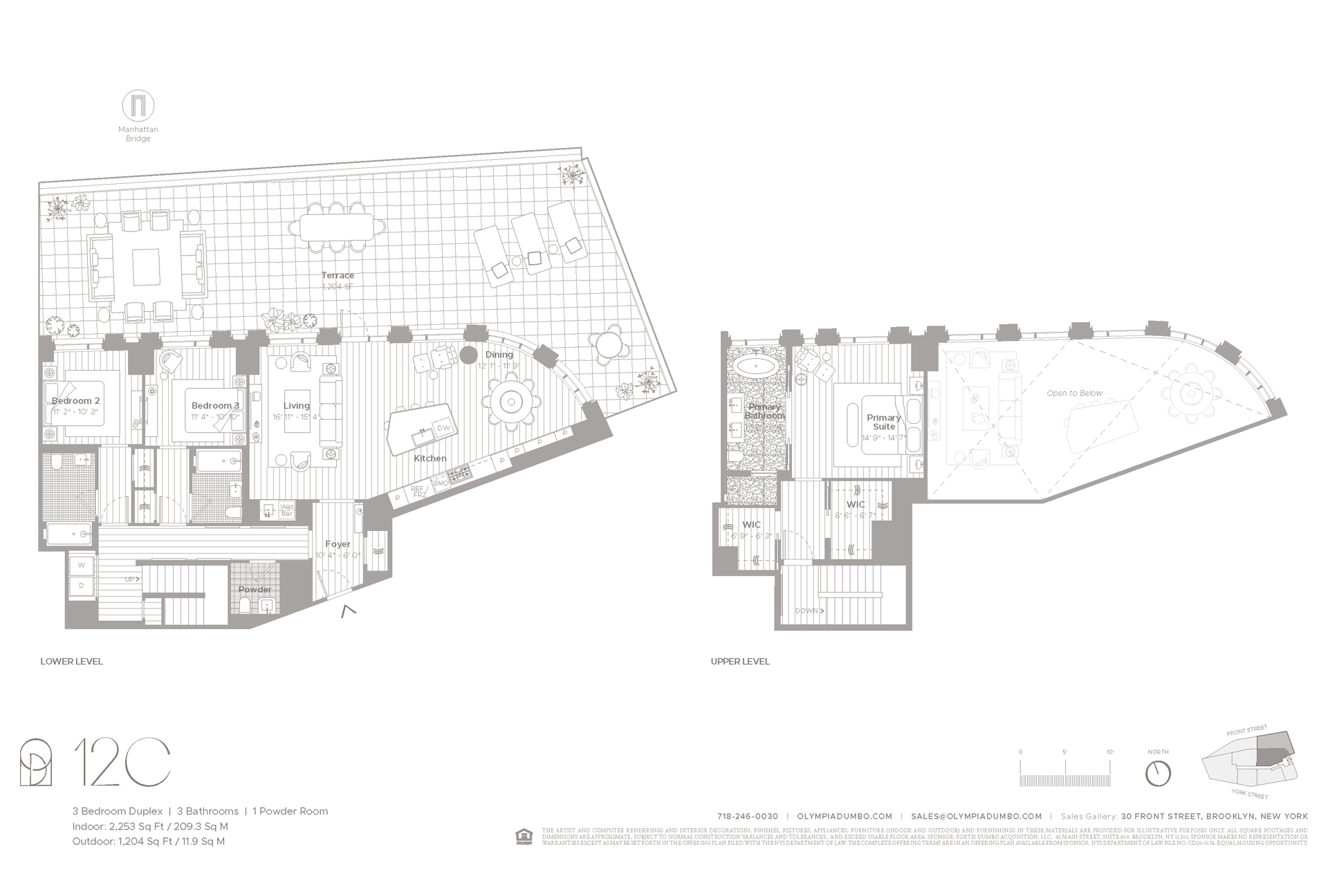 Introducing Duplex Residence 12C. With ceilings soaring up to 18’-6 1⁄2”, this three-bedroom, three-and-a-half-bathroom residence offers an impressive 1,204 SF private terrace with direct views of the Manhattan Bridge and East River.