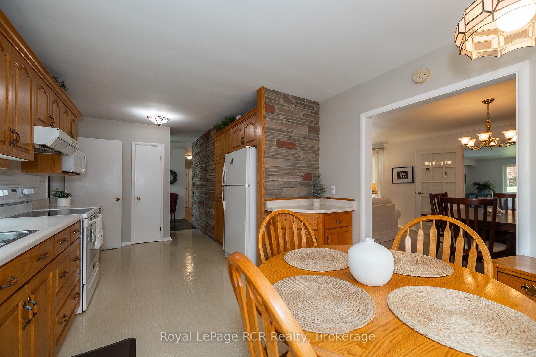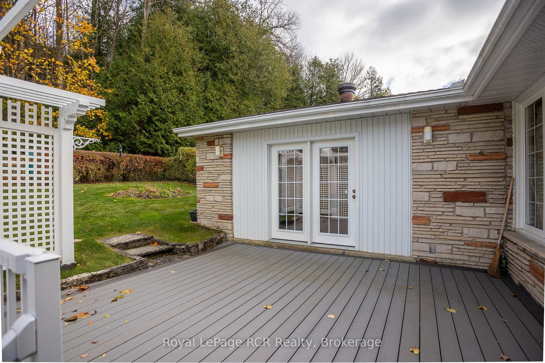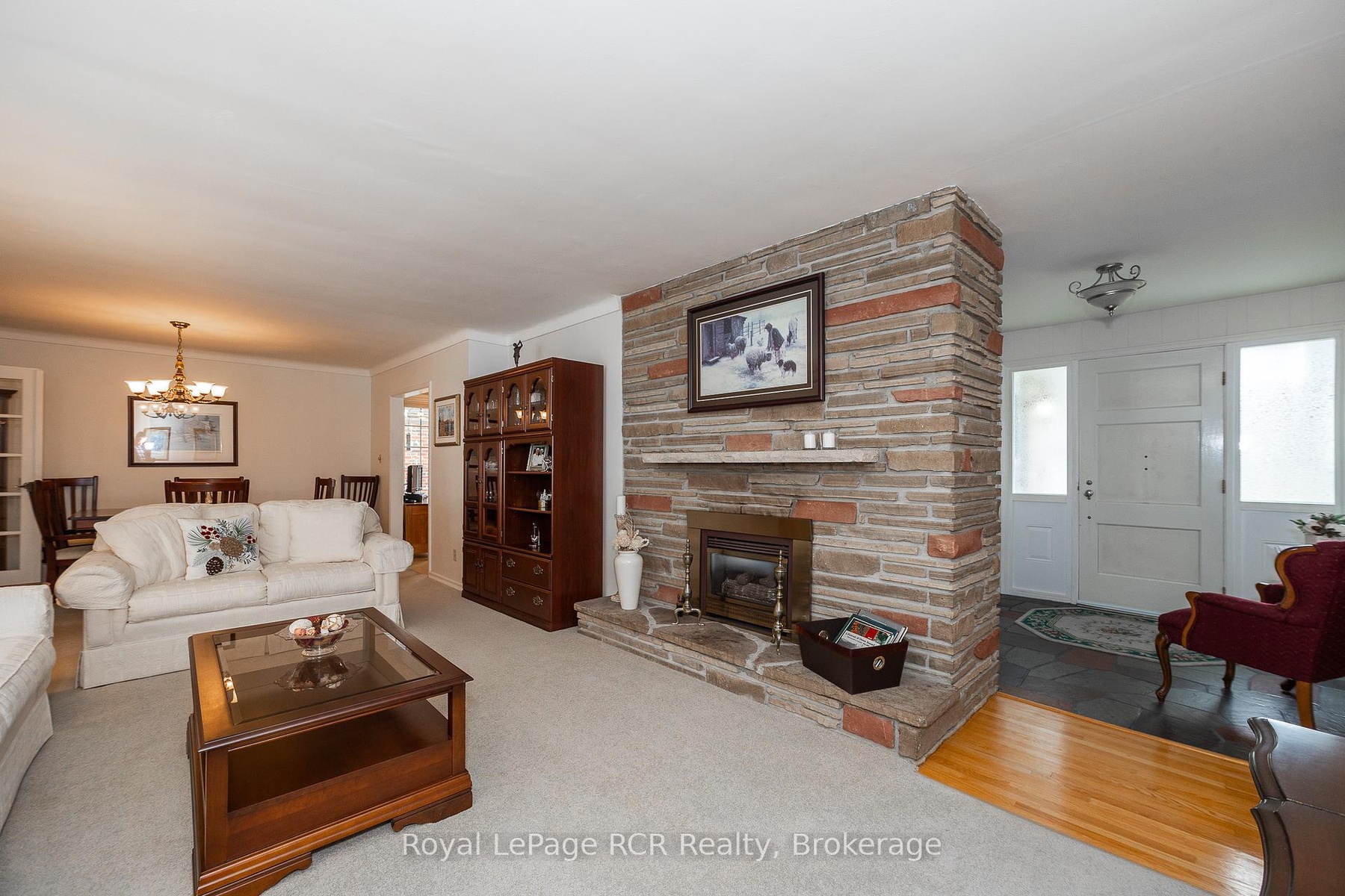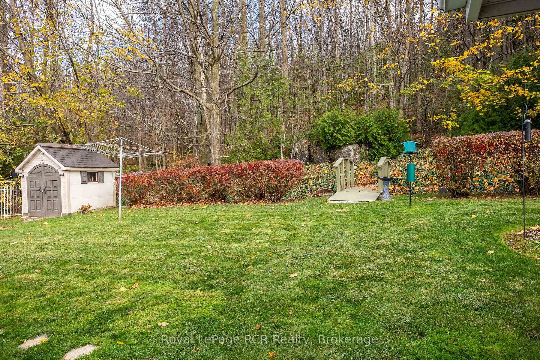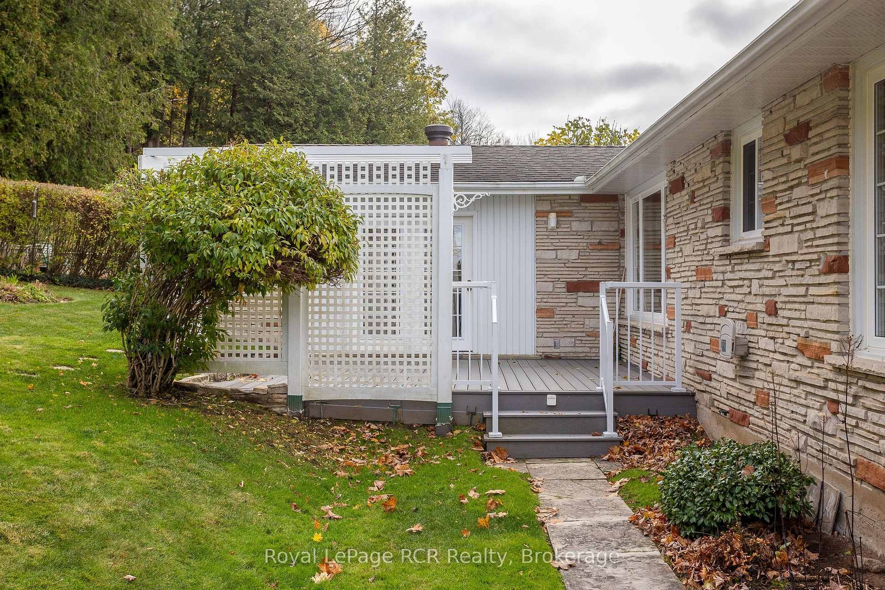 Welcome to this beautifully maintained 3-bedroom stone bungalow nestled in one of the area's most desirable neighbourhoods. Backing directly onto the scenic Bruce Trail, this home is a haven for nature lovers and outdoor enthusiasts. Step inside the generous foyer to a spacious open-concept living and dining area, complete with a cozy fireplace - ideal for entertaining or relaxing evenings at home. The bright, sun-filled main floor family room opens onto a generous composite deck, perfect for hosting gatherings or simply enjoying the outdoors in your own private backyard oasis. The eat-in kitchen features high-quality, custom Brubacher cabinetry and offers a warm, functional space for casual family meals. Throughout the home, you'll find ample storage and thoughtful design that makes everyday living effortless. With a large driveway and attached garage, there's plenty of parking for family and guests. This home combines comfort, style, and location all in one welcoming package.