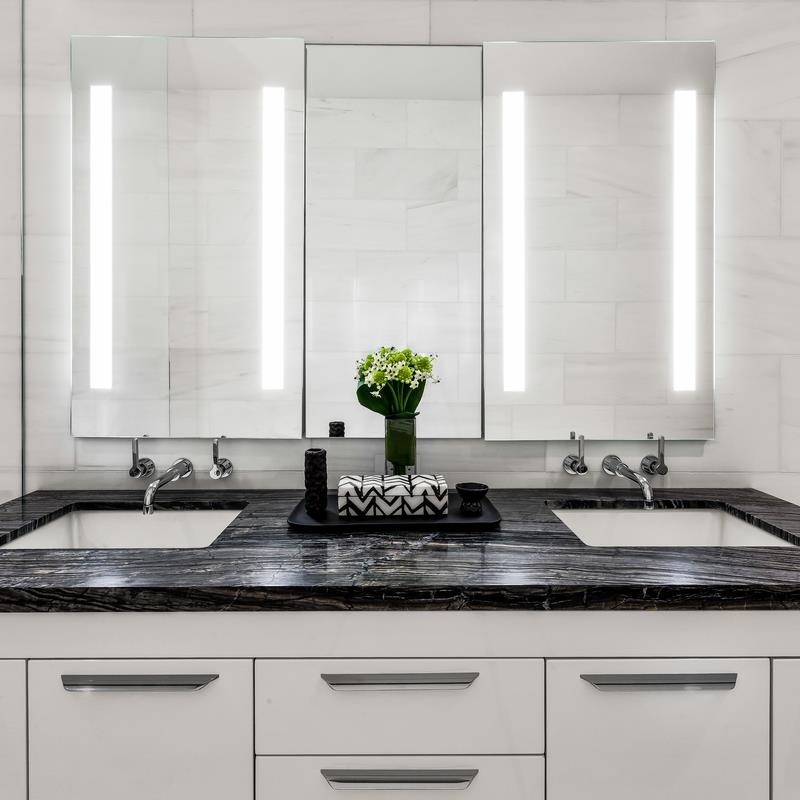 The primary bedroom offers direct access to the terrace and features a luxurious bath, complete with a double vanity, abundant storage and walls and floors clad in Bianco Dolomiti white marble. A custom Minimal vanity with dual Kohler sinks and Lefroy Brooks fixtures enhances the refined design.