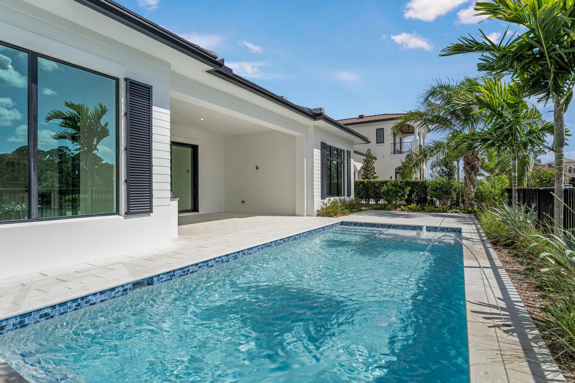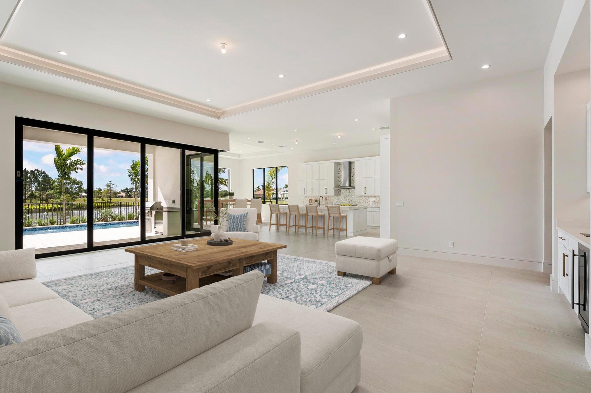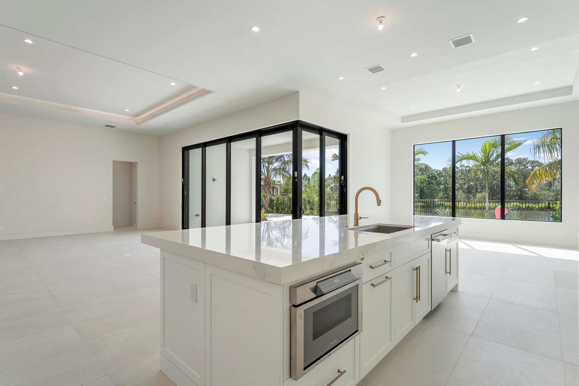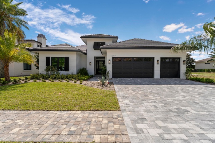 Experience the pinnacle of luxurious living with the newly constructed Augusta Custom Pool Home by Ecclestone Signature Homes. This exquisite coastal modern residence offers breathtaking water views and is located within the highly sought-after Tesoro Club, a prestigious gated golf community. This expansive one-story home features four bedrooms and 4.5 baths, complemented by a wet bar and a walk-in pantry.The open floor plan is perfectly designed for both relaxation and entertaining. The gourmet kitchen is a chef's dream, featuring high-end Thermador appliances, a generous center island with back-to-back cabinetry, elegant quartz countertops, a full backsplash, and stunning cabinetry. Numerous upgrades are included, with project completion anticipated in early spring 2025.