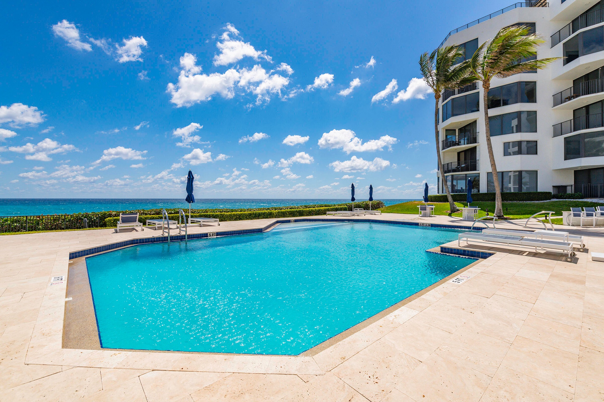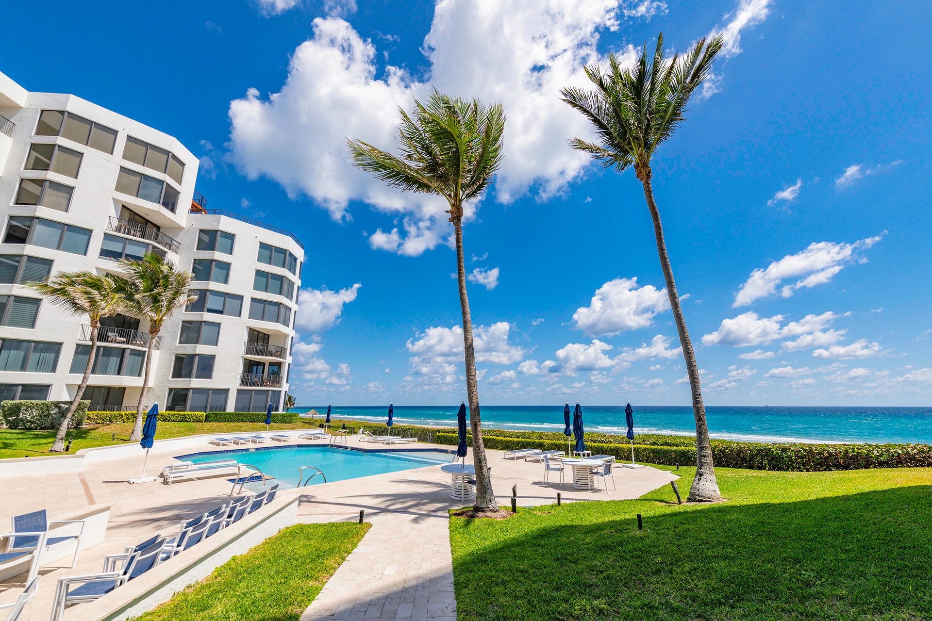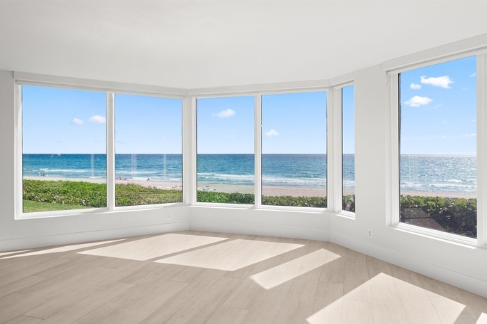 Can you hear the ocean calling? This oceanfront retreat with private beach access offers panoramic Atlantic views from every single room, there isn't a corner without a view. Fully renovated and spread across two levels, the home merges modern coastal elegance with rare privacy. The chef's kitchen shows off quartz counters, marble backsplash, custom CopperSmith hood, and Cafe, Dacor & AGA appliances. Sunlight floods through floor to ceiling impact glass, highlighting a dramatic staircase and inviting fireplace.Every day feels like a staycation, heated saltwater pool, sundeck, BBQ space, intracoastal park, garage parking, storage, beach chairs and umbrellas ready, pet-friendly, and seasonal rentals allowed (once per year with Board approval). No assessments, fully funded reserves..