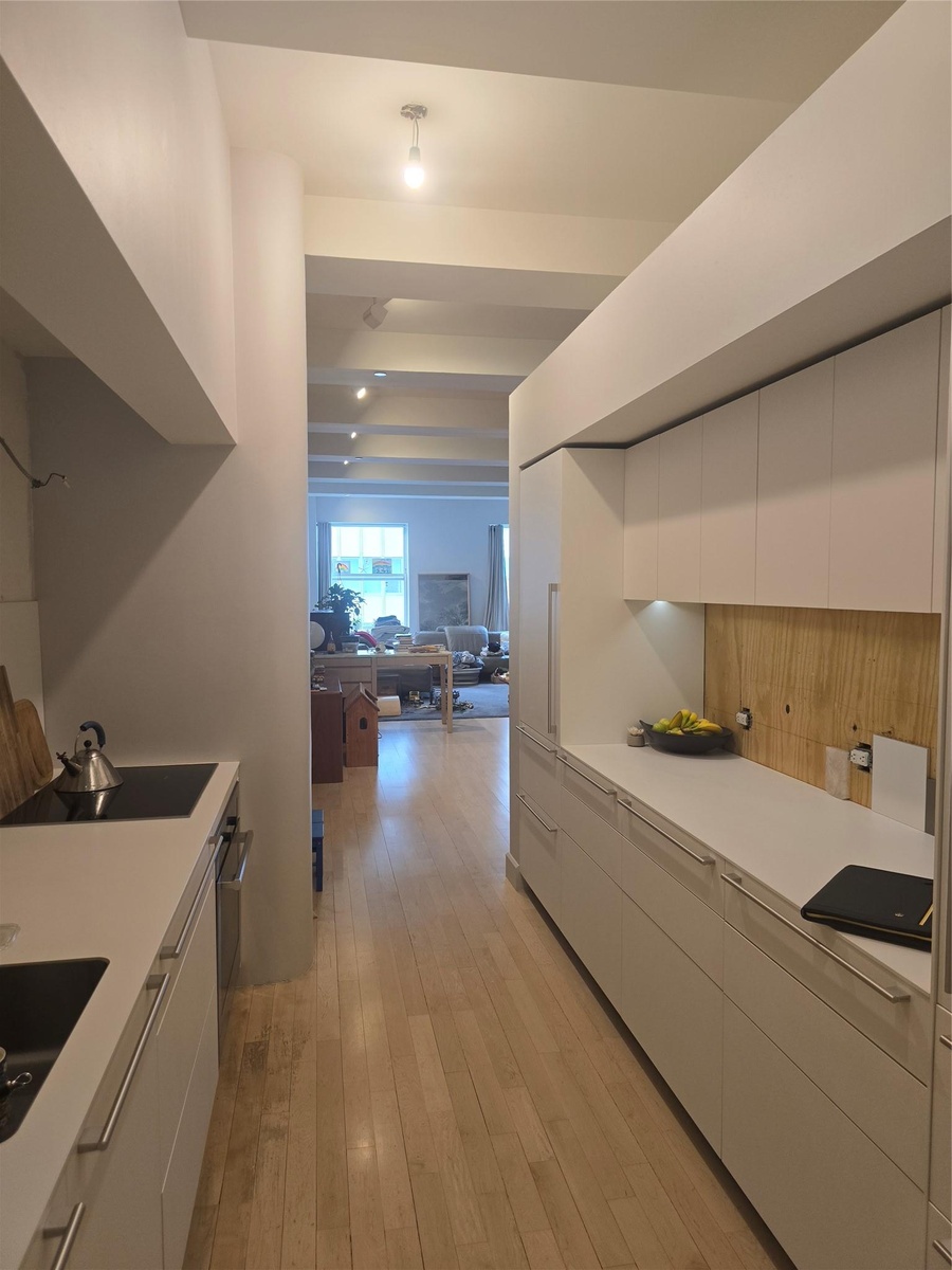 - Kitchen featuring white cabinets, cooktop, light countertops, and light wood-type flooring