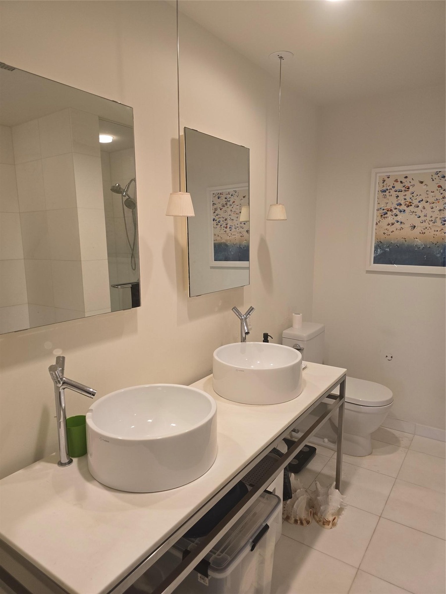 - Bathroom featuring tile patterned flooring, a sink, toilet, and double vanity
