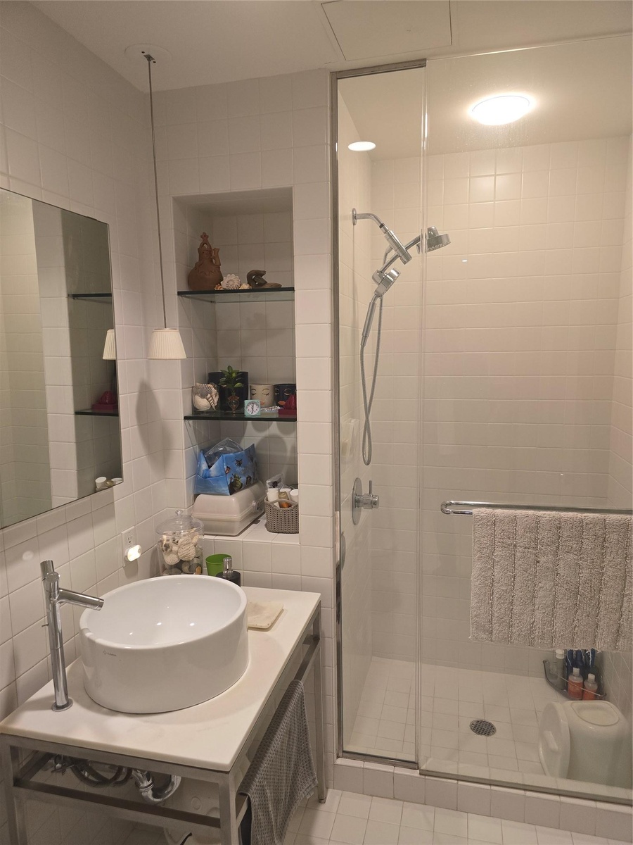 - Bathroom featuring a stall shower, a sink, backsplash, and tile walls