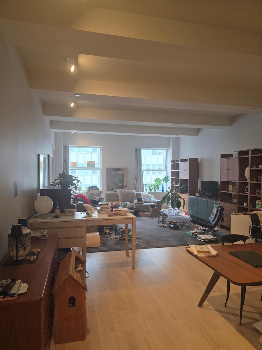 - Living area with plenty of natural light, wood finished floors, and beam ceiling
