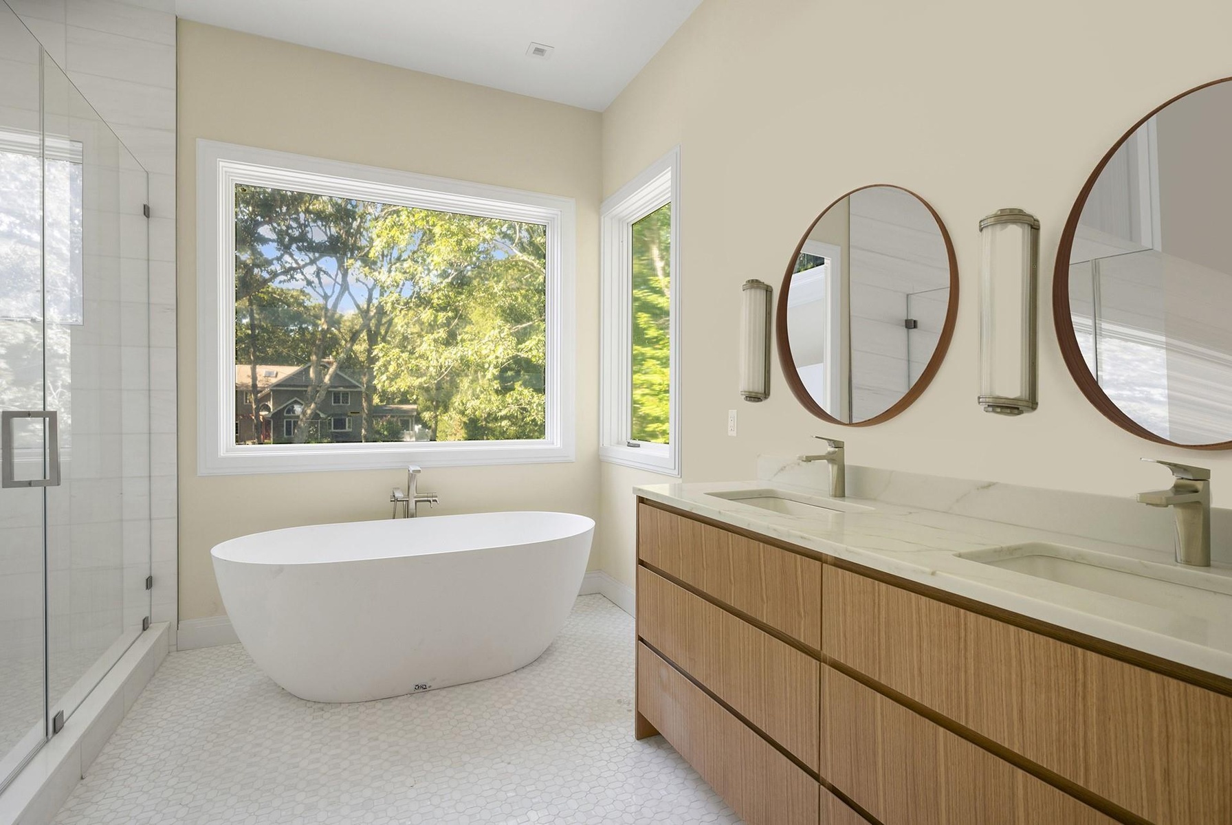 - Full bath with a soaking tub, double vanity, a stall shower, and light tile patterned floors
