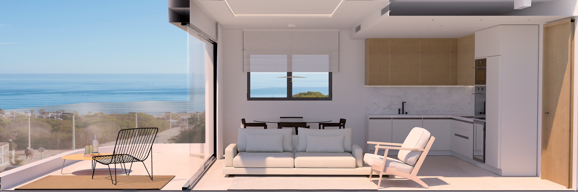 Top floor flats with large balcony, private solarium and spectacular sea views, perfect for enjoying the Mediterranean sun.