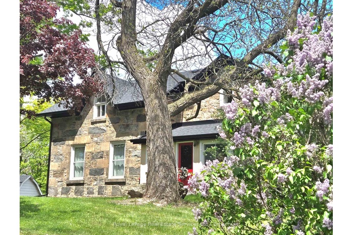 34+ Acres approx, fibre optics internet now hooked up, walk to Farm Boy, walk-in clinics, Shoppers Drug Mart, Longo's, Starbucks and great restaurants. Gorgeous escarpment views, note zoning is Escarpment Rural Area, less restrictive than Escarpment Protected Area and potential to designate the adorable stone home and receive a permit to build a second new home. Lots of options for beautiful sites set way back from the road with escarpment views to north and west, even a small forest with trails. Charming stone home, 60' X 120' indoor riding riding arena, and approx 19 stall barn, just north of Hwy 407, this beautiful home and property comprises approx 34 acres of which approx 25 acres are workable, a small wooded forest, and charming residence nicely nestled within a stately homestead setting. Rare opportunity here to own such a large parcel of land so close to all the amenities...many options here...buy and hold for multi generational planning...move in and have fun...or lease and hold! Shingles, eavestrough, energy efficient heat pumps, 2024. Seller may take back mortgage!