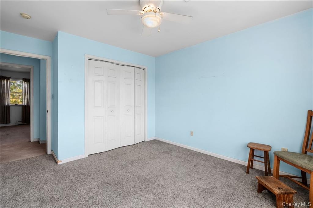 - Carpeted bedroom featuring baseboards, a closet, and a ceiling fan