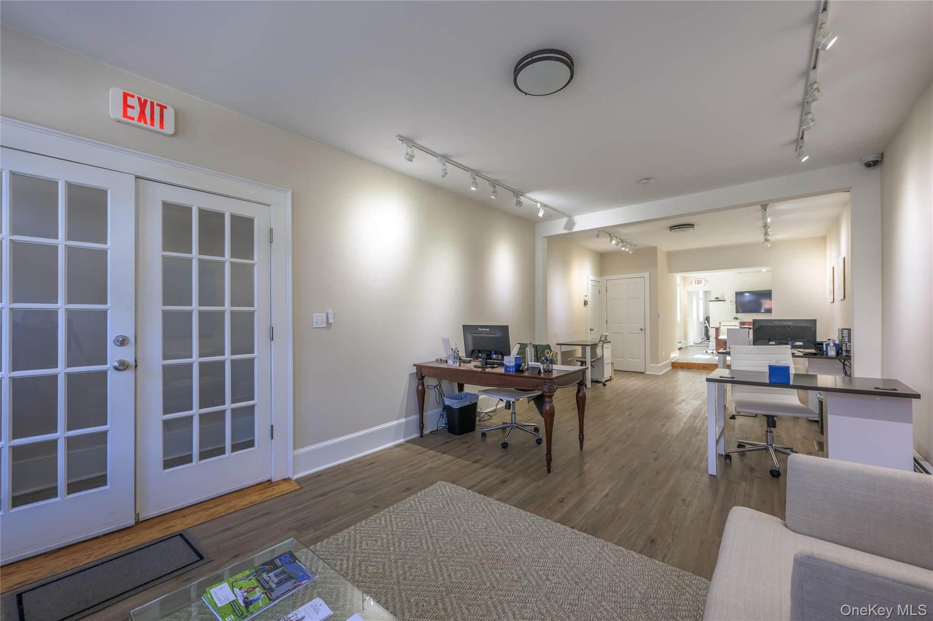 Prime Mixed-Use Property on Warren Street. This exceptional property offers the perfect blend of commercial and residential space in a sought-after Warren Street location. The ground floor features a spacious, open-plan layout, currently serving as a real estate office. A well-equipped kitchen in the rear includes commercial under-counter refrigerators and a high-end dishwasher. Situated just steps from The Maker, Le Perche, and Feast & Floret, this vibrant block is a true destination. Upstairs, a stunning two-bedroom apartment boasts soaring 10-foot ceilings. The light-filled dining room, adorned with restored Tuscan columns and dentil molding, seamlessly connects to an elegant living area. The front bedroom, accessed through classic French doors, is bathed in natural light from the north and west and offers ample closet space. A well-appointed bathroom and an efficient kitchen sit off the dining room. Towards the rear, the second bedroom features a cozy gas fireplace and opens onto a private enclosed deck, overlooking the lush garden and neighboring park. Additional highlights include a private patio garden, off-street parking, and a dry basement with abundant storage space. Meticulously maintained by a professional property management team, this move-in-ready property has been fully upgraded for modern comfort and convenience.