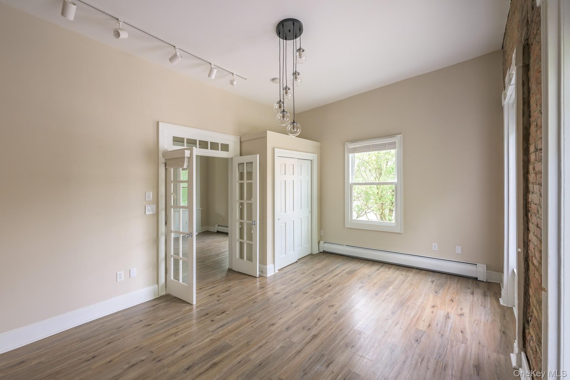 - Empty room with track lighting, a baseboard heating unit, french doors, and wood finished floors