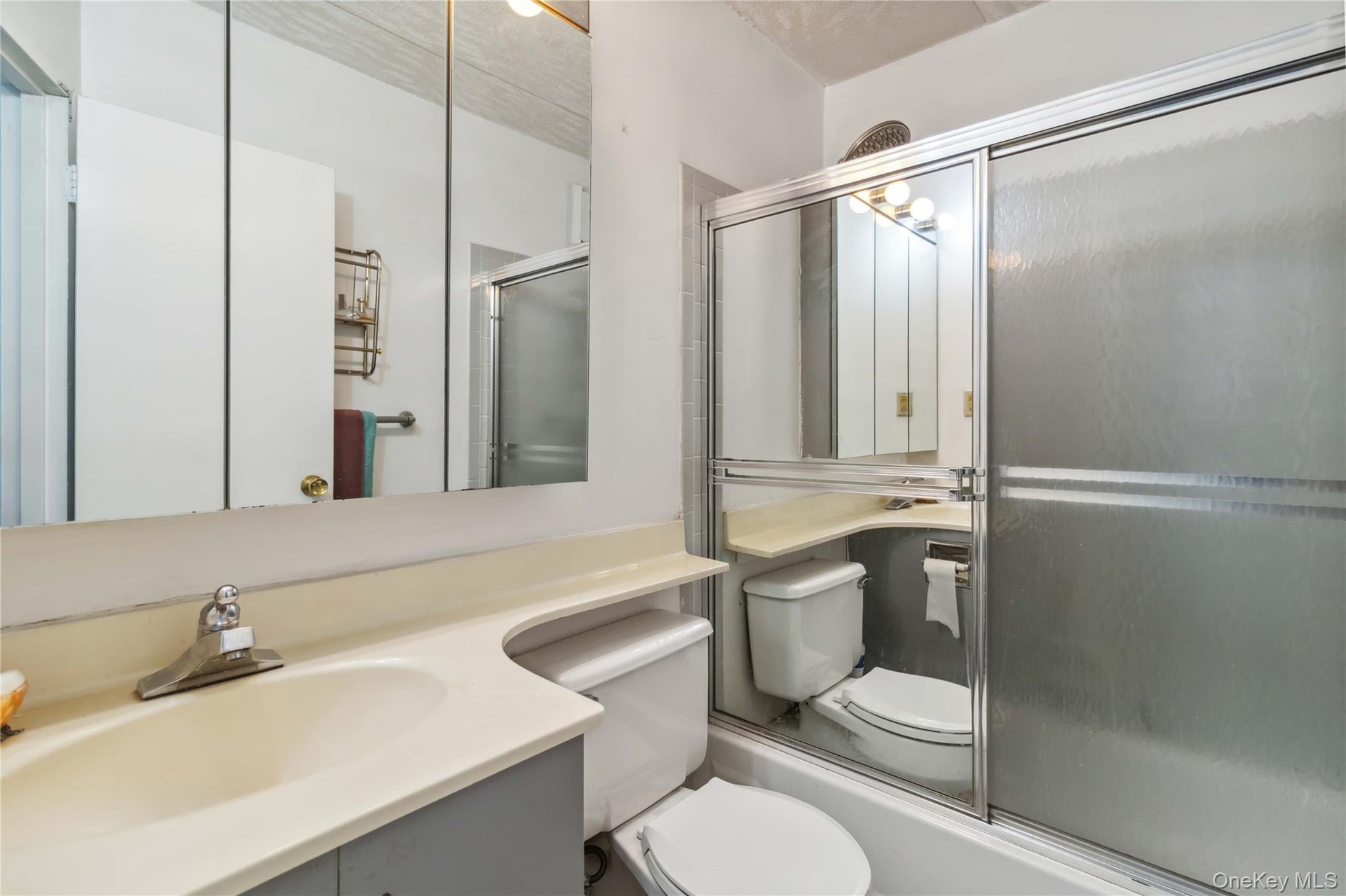 - Full bathroom with toilet, vanity, and an enclosed shower
