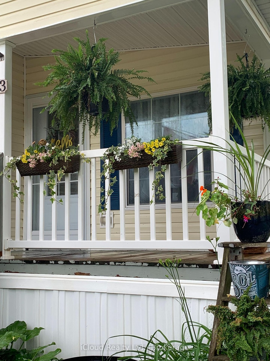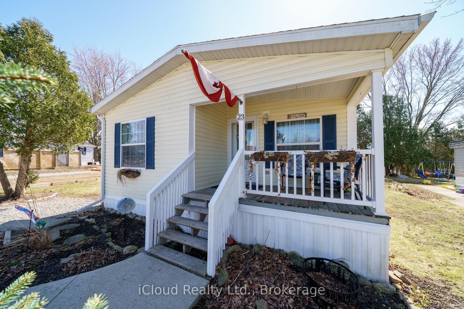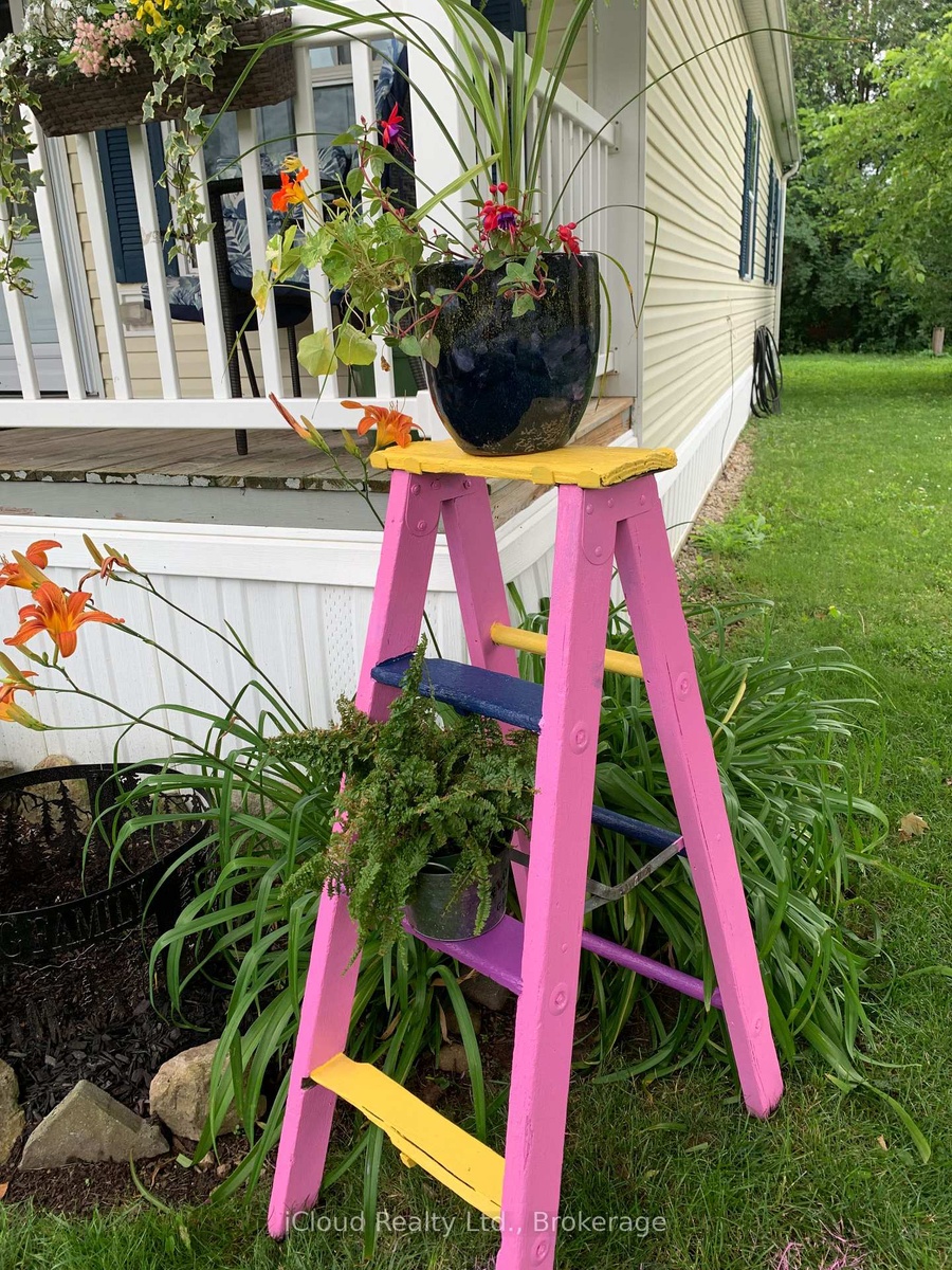 Welcome to the exquisite Beverly Hills Estates within the vibrant Parkbridge community! This charming 2-bedroom bungalow at 23 Macpherson is surrounded by beautifully landscaped perennial gardens and features a welcoming covered front porch. Step inside to discover a spacious open-concept layout highlighted by soaring cathedral ceilings, creating an inviting atmosphere. The kitchen is a chef's dream, complete with a cozy breakfast nook, ample cabinetry, and generous countertop space. For even more functionality, a central island provides additional workspace while overlooking the sunlit living room. The home boasts two well-proportioned bedrooms with ceiling fans, with the primary suite featuring a three-piece ensuite and double closets for your convenience. An additional versatile room at the back of the house can serve as a third bedroom, office, playroom, craft space, workout area, or cozy sitting/T.V. room the possibilities are limitless! A beautifully finished laundry room offers access to the side yard, complete with a deck and two handy sheds. The property also includes a double driveway for ample parking. As a resident of this fantastic community, you'll have access to the Recreation Center, where you can enjoy activities like pool, cards, bingo, and darts, or host events in the full kitchen with family and friends. Adults can unwind at the horseshoe pits, adding to the sense of community and enjoyment. Conveniently located on a paved circle in a serene rural setting just off Hwy 6, this home provides easy commuting to Burlington, Cambridge, Guelph, Hamilton, Milton, Oakville, and Waterdown. You're just 15 minutes from the 401 and 403 highways. The lease fee of $800.64 includes property taxes, snow removal for common areas, and grass cutting, making this an incredible opportunity to enjoy a vibrant lifestyle in the popular Parkbridge community. Don't miss out on calling this beautiful bungalow your new home!