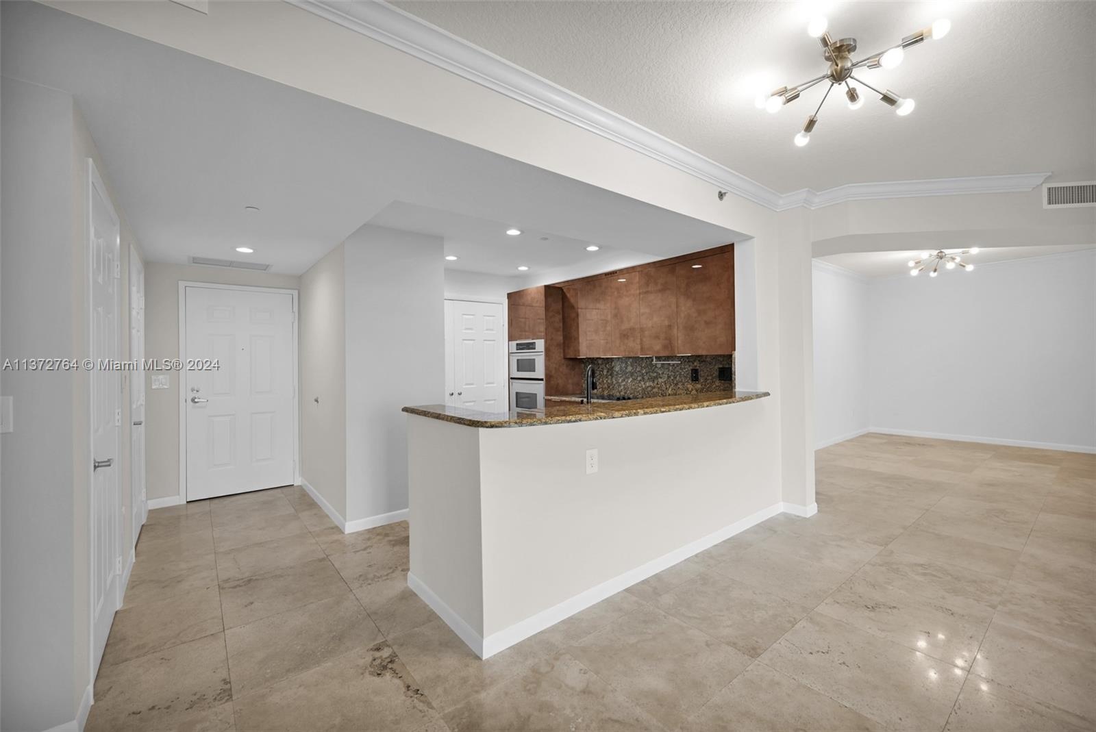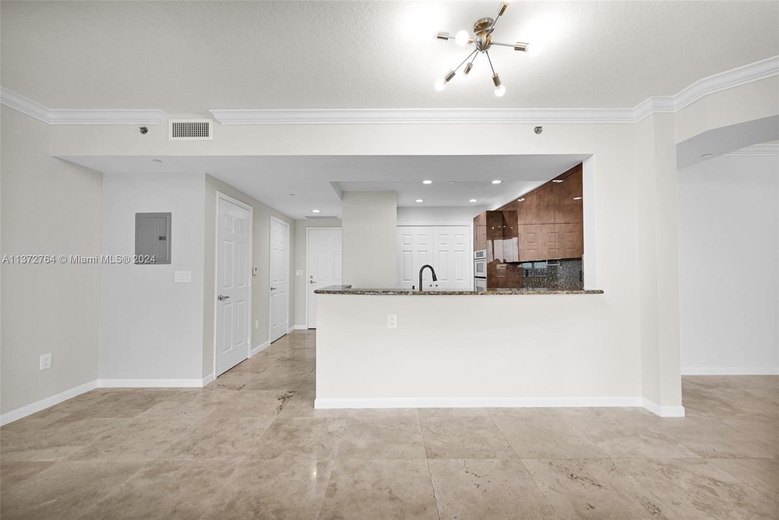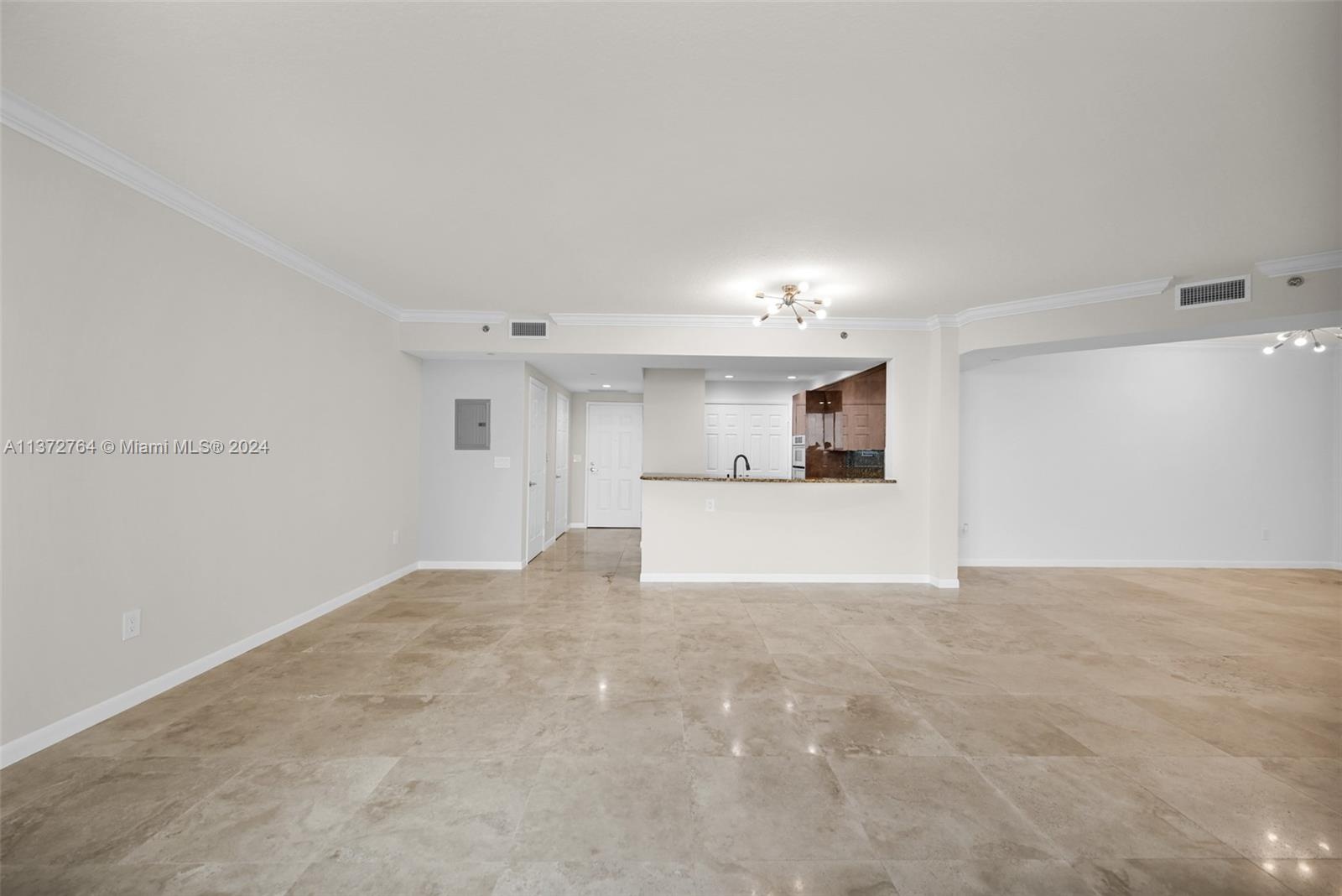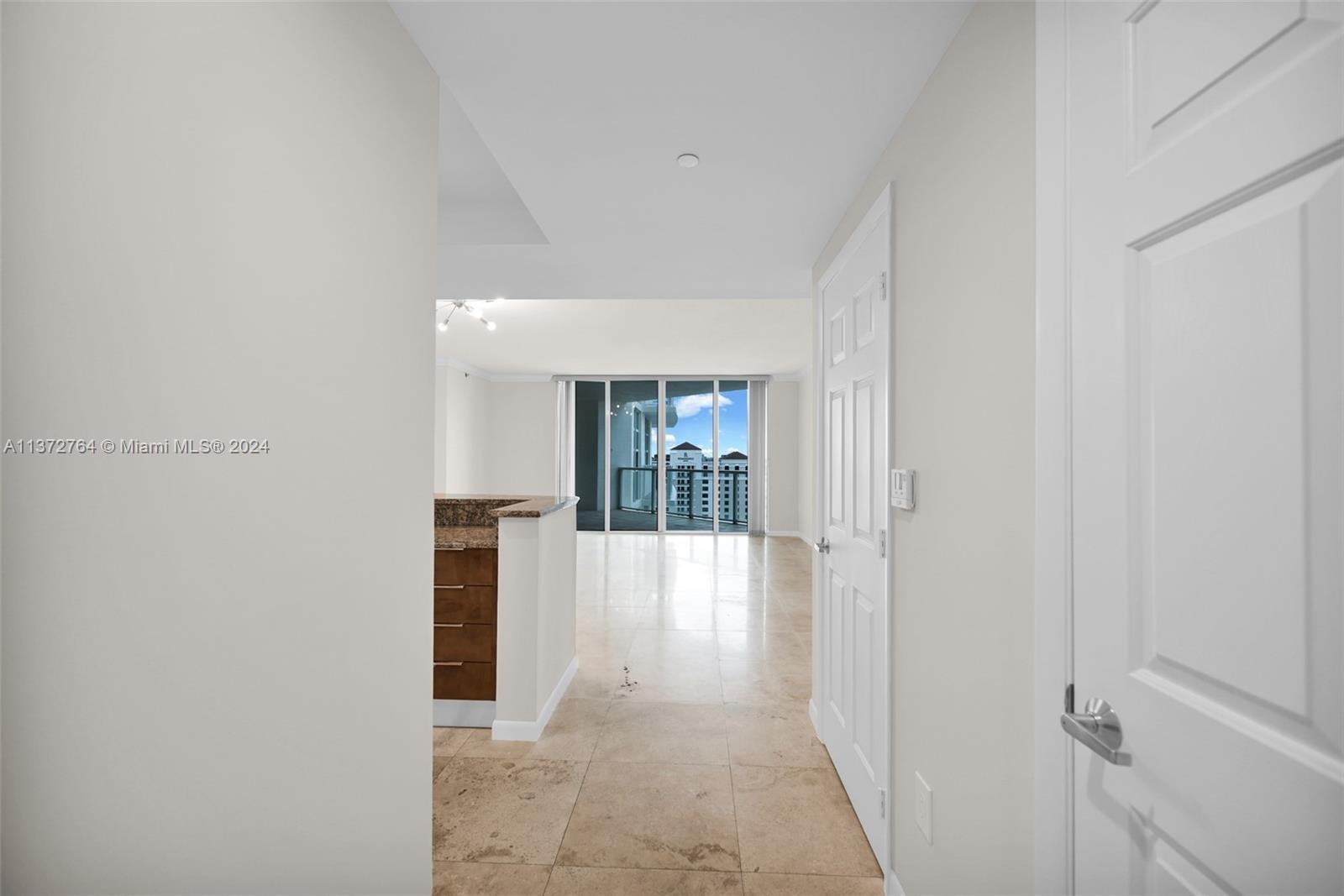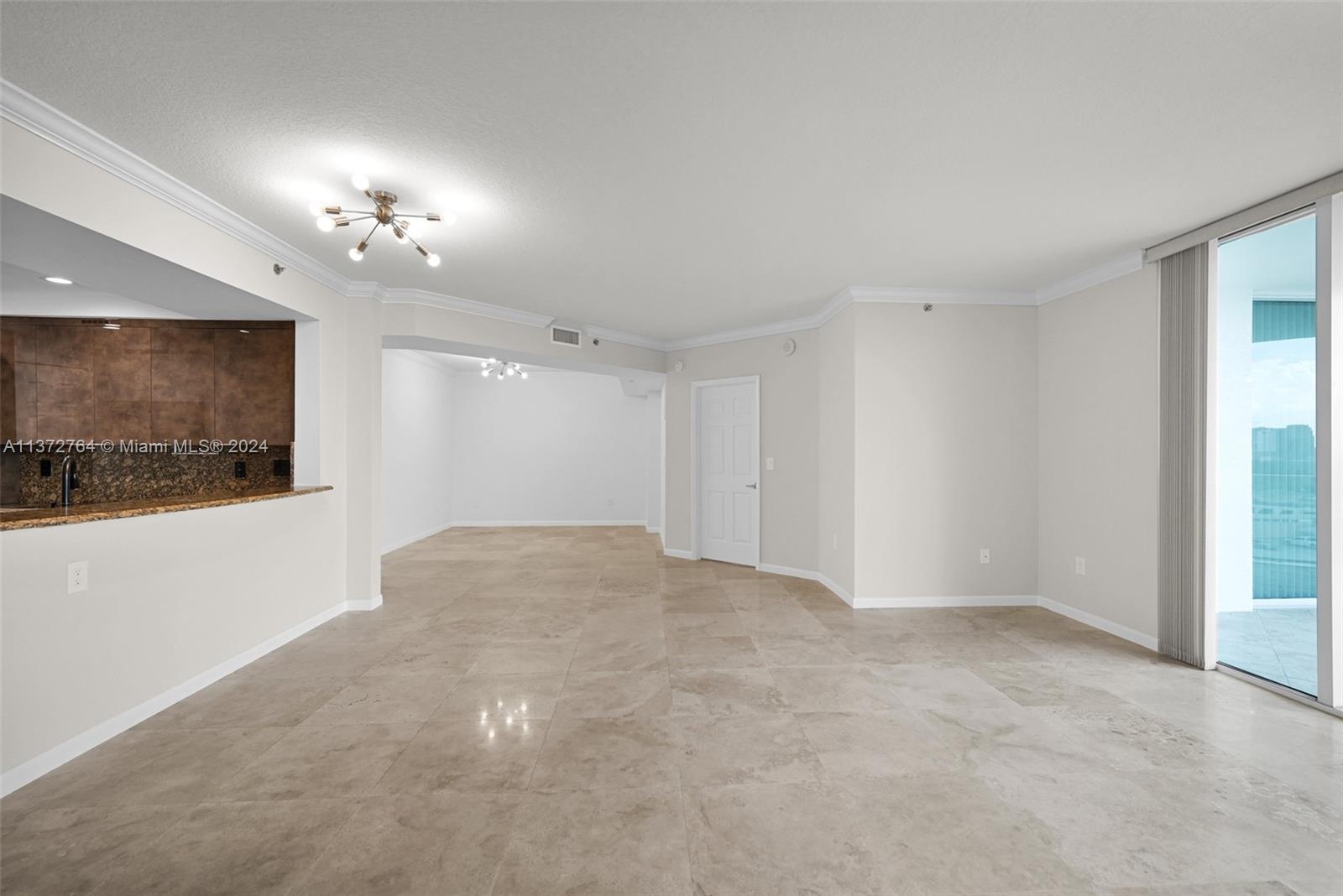 Luxury high rise w spacious rooms, high ceilings, natural stone flooring and floor to ceiling windows.