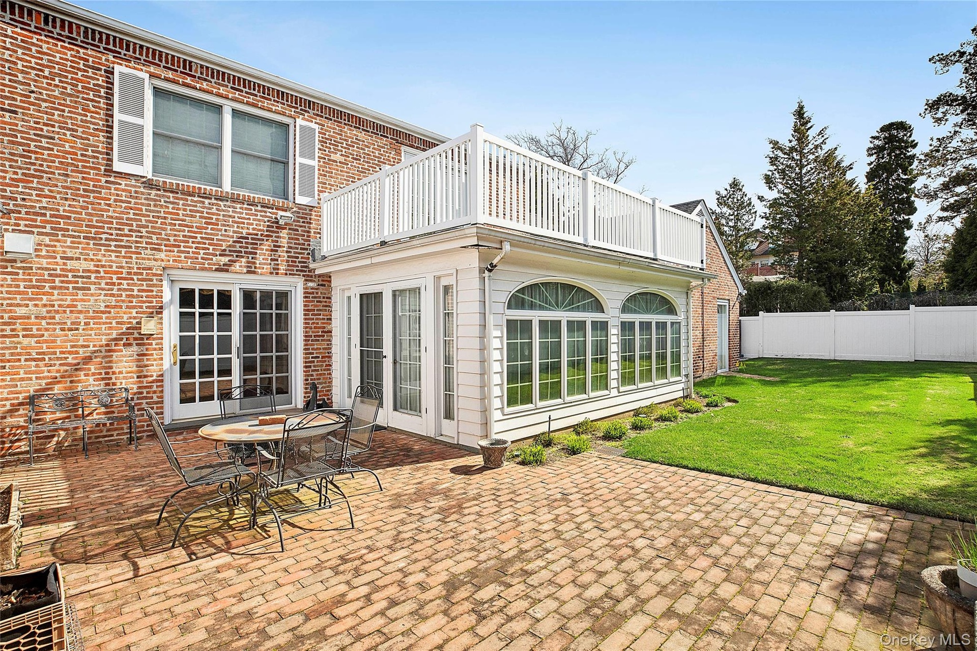 - Back of property with fence, a balcony, a patio area, brick siding, and a lawn