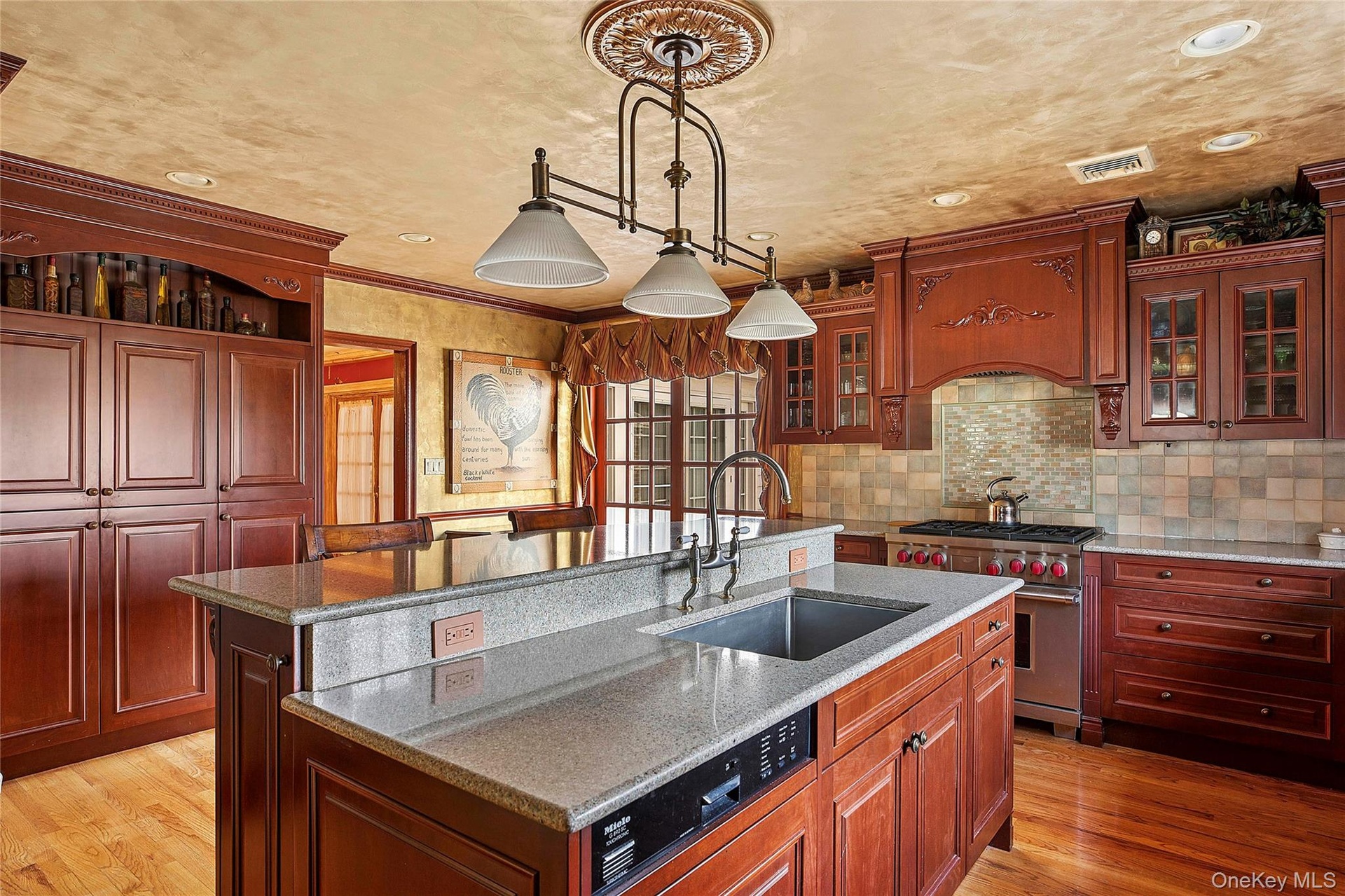 Exuding sophistication, The home showcases bespoke craftsmanship, including intricate woodwork, Grand staircases, handcrafted chandeliers, and marble flooring. Designed for both comfort and entertaining, the expansive formal living room flows into a state-of-the-art kitchen, Featuring custom cabinetry and top-tier Wolf and Sub-Zero appliances, A partial bridge and water from the kitchen window enhances the space, While a spacious patio off the kitchen provides the perfect setting for outdoor dining and relaxation.