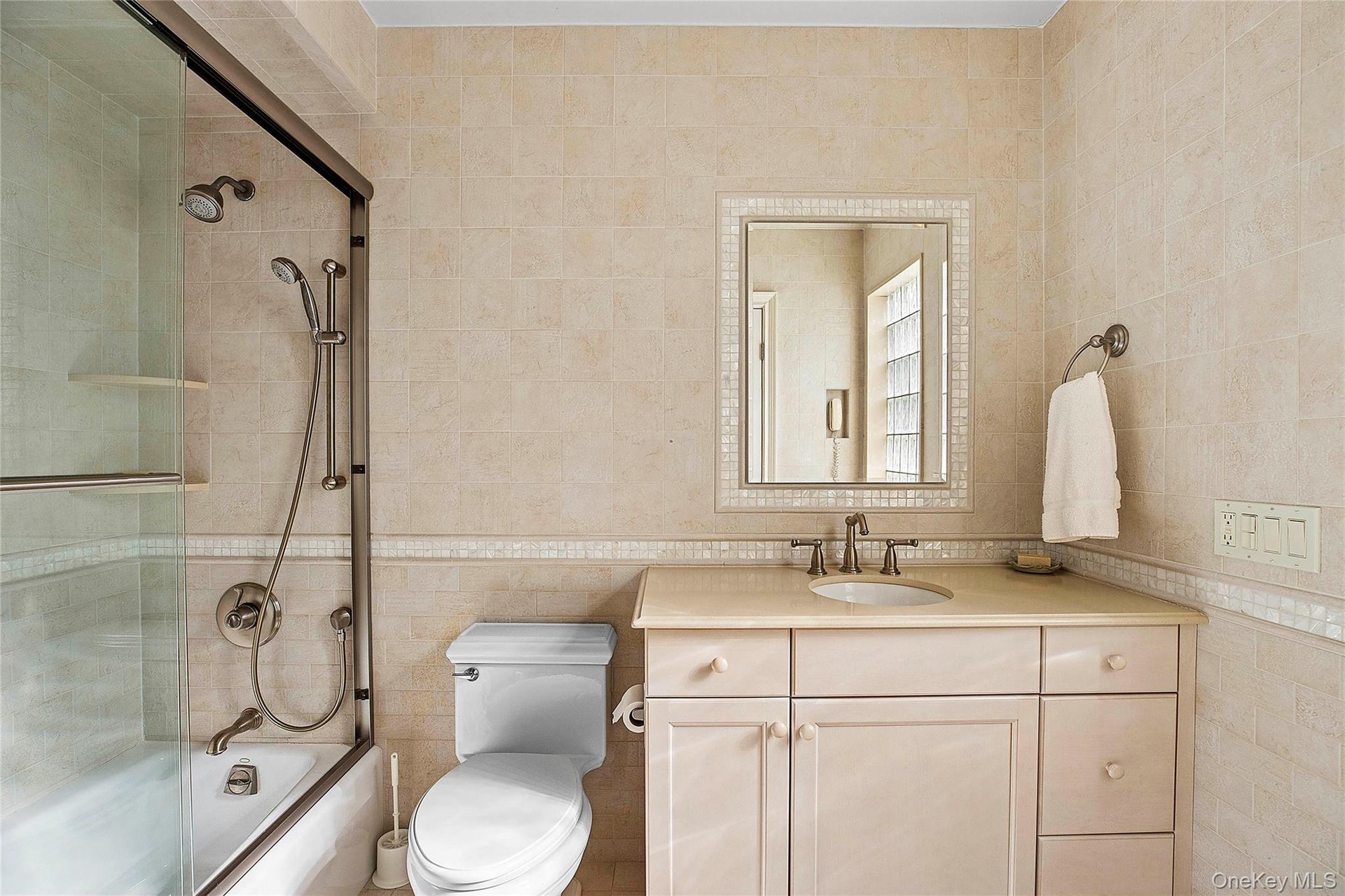 - Bathroom featuring toilet, vanity, bath / shower combo with glass door, and tile walls