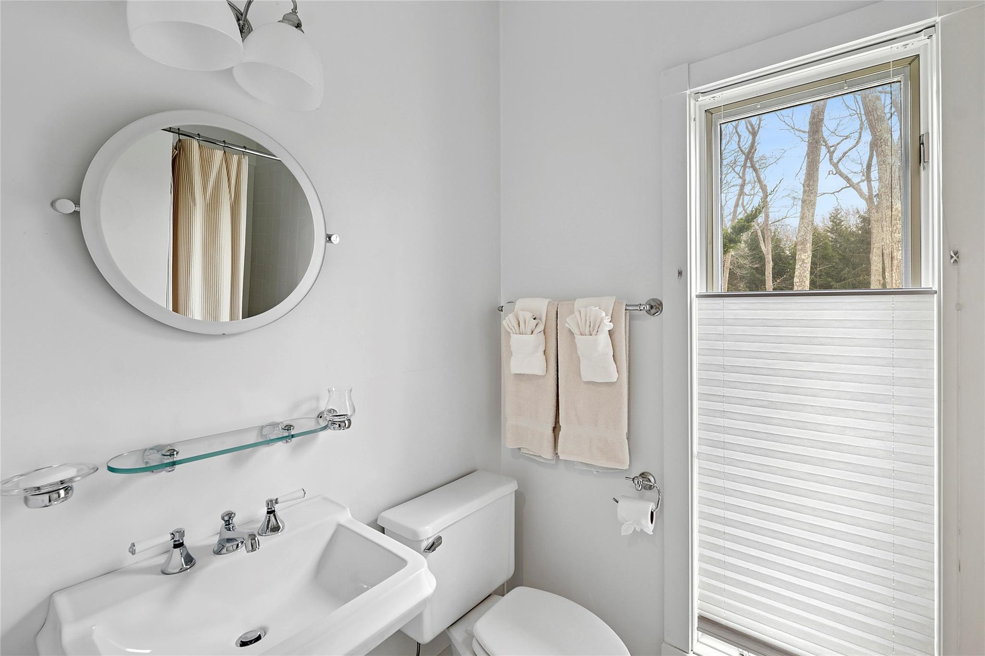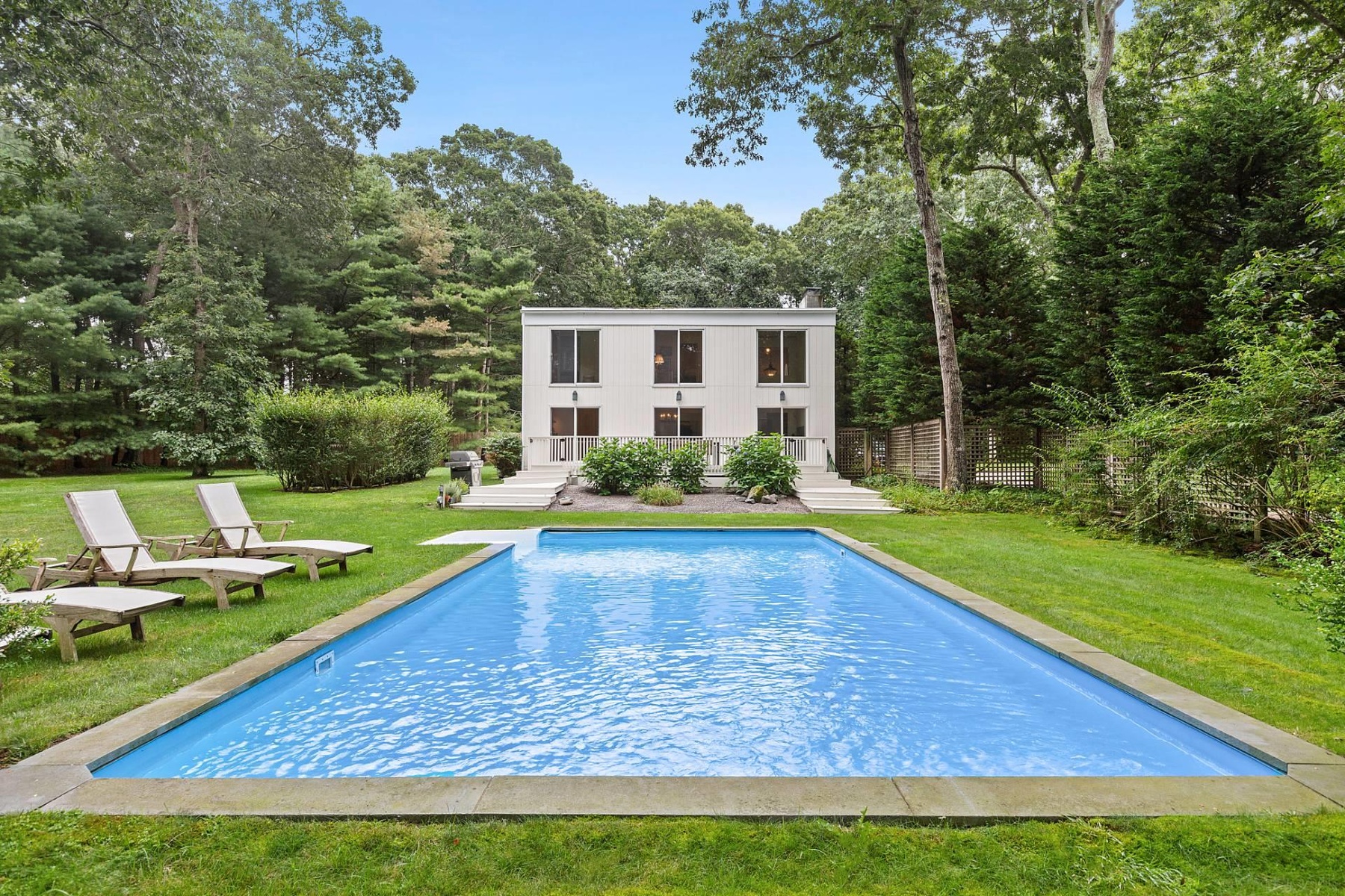 This elegant modern residence, a creation of renowned architect Harry Bates, exudes timeless architectural sophistication. Nestled on 2 sprawling acres in the heart of East Hampton Village, the home offers a harmonious blend of classic charm and contemporary living. Spanning approximately 3,724 square feet, the two-story layout features 5 bedrooms and 4 bathrooms, with seamless flow throughout the main living spaces-including a welcoming family room, a sunlit living room with fireplace, and an open-concept kitchen. Upon entry, a gracious foyer leads into the family room with sliding glass doors that open to the backyard. The kitchen is outfitted with top-tier appliances including a Sub-Zero refrigerator, Viking range, and Bosch dishwasher, plus a generous walk-in pantry for ample storage. The dining area and living room transition effortlessly to an expansive deck with built-in outdoor barbecue through a wall of sliding doors-ideal for indoor-outdoor entertaining. The first floor also features a spacious den that can be converted to a bedroom, a full bath, and a two-car garage. Upstairs, you'll find four large bedrooms, including the primary suite, along with three full bathrooms. The primary suite offers a private office-perfect for working from home-and a luxurious en suite bathroom with dual vanities, a soaking tub, and separate shower. Outside, the meticulously landscaped grounds showcase a heated pool, mature trees, specimen plantings, and a lush lawn. The expansive lot also allows room for a potential tennis court, pickleball court, or guest house. Ideally located south of the highway, the property provides easy access to ocean beaches, the village's shops and restaurants, and embodies the quintessential East Hampton lifestyle with the perfect balance of elegance, privacy, and convenience