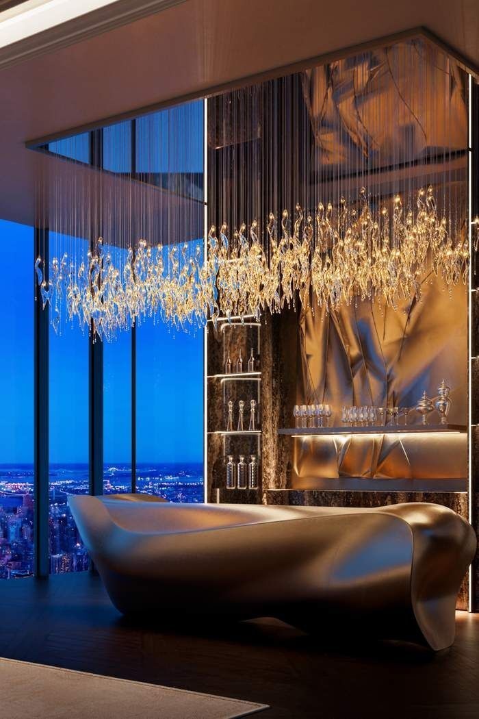 ENTERTAINING SUITE: A direct elevator enters to a grand receiving hall with white macauba stone ?ooring leading to the expansive Great Room with custom smoke-gray solid oak ?oors in an intricate pattern. An ideal place for dining and entertaining, complemented by a sophisticated library area, offering expansive views of the Manhattan skyline. The corner south kitchen offers stunning city skyline views, custom cabinetry designed by Studio So?eld, crystallo white quartzite countertops and backsplash, and a full suite of Gaggenau appliances, a gas cooktop with a fully vented hood, steam oven, and wine refrigerator. A private Sunset Lounge and outdoor terrace, facilitates effortless indoor-outdoor living at an extraordinary elevation.