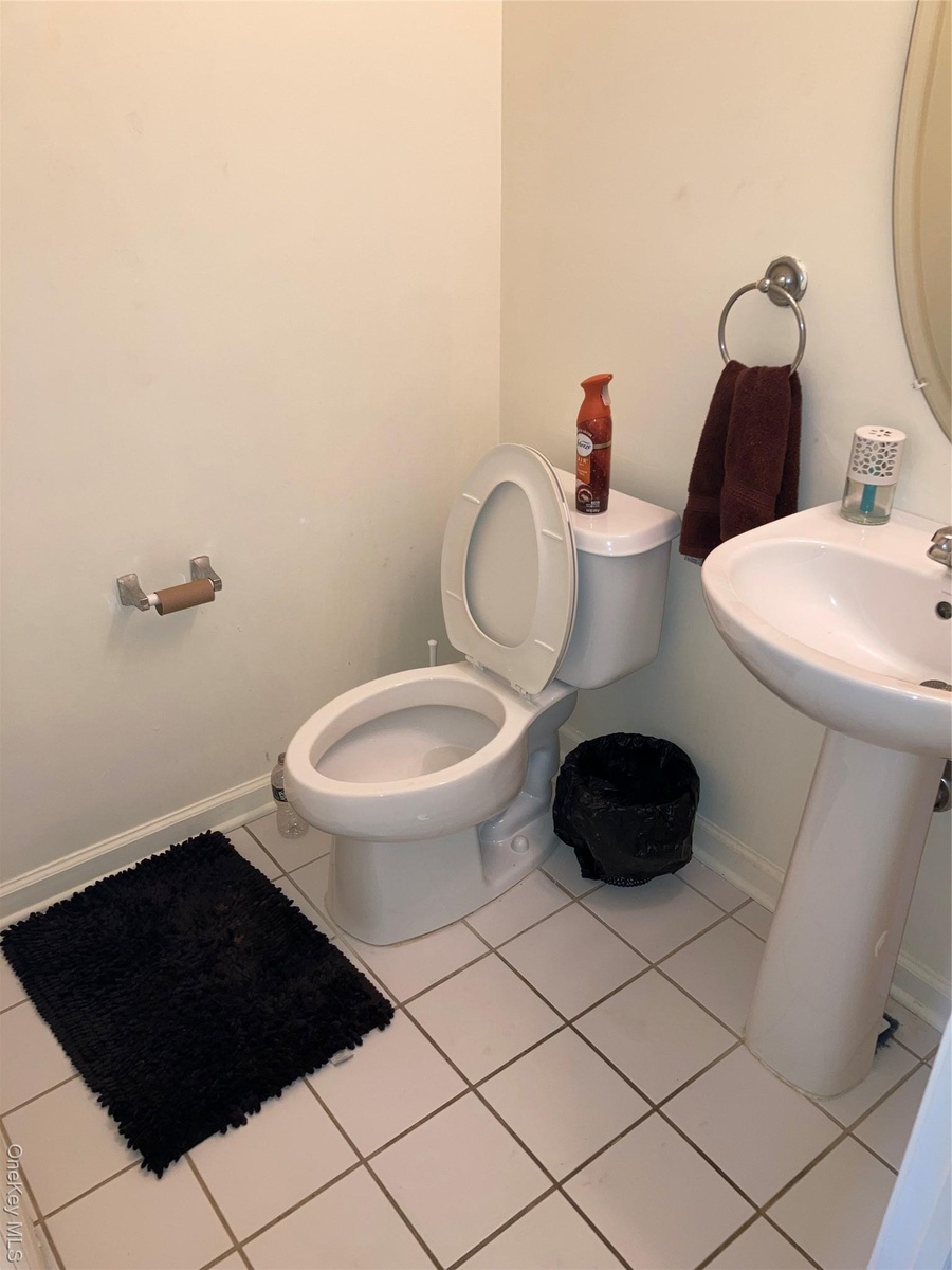 - Half bath featuring toilet, tile patterned floors, a sink, and baseboards