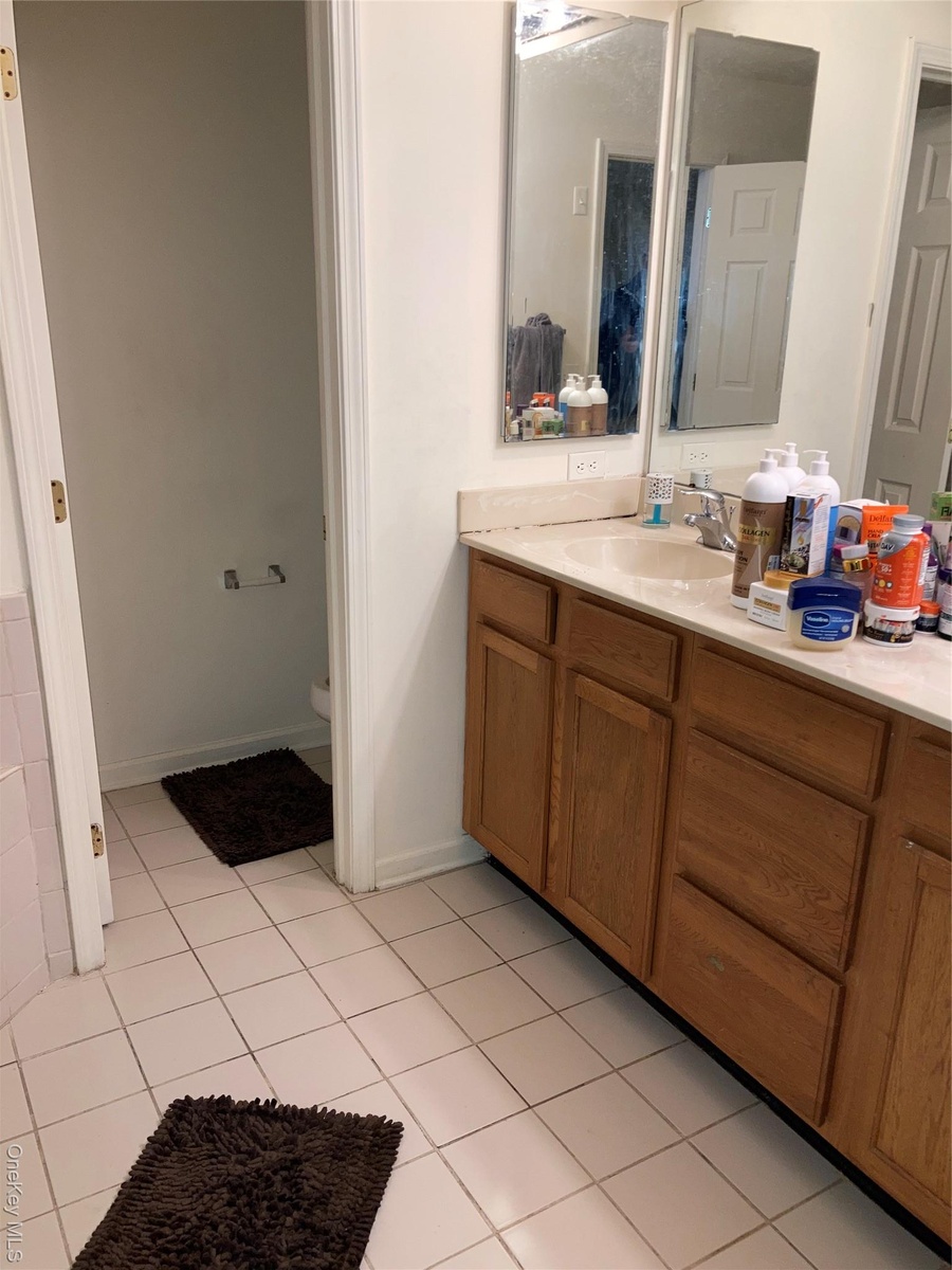 - Bathroom with toilet, vanity, and tile patterned flooring
