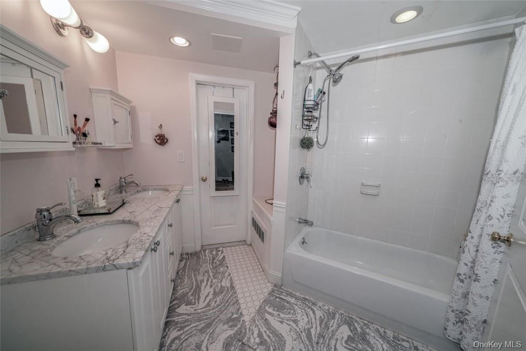 - Bathroom featuring tile floors, shower / bath combination with curtain, double sink, and vanity with extensive cabinet space
