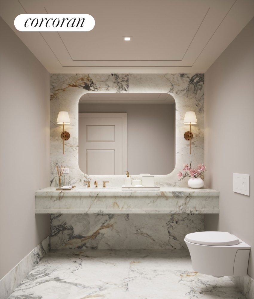 A striking powder room features Panzer honed marble throughout, while a spacious laundry room includes a sink and LG washer and dryer.