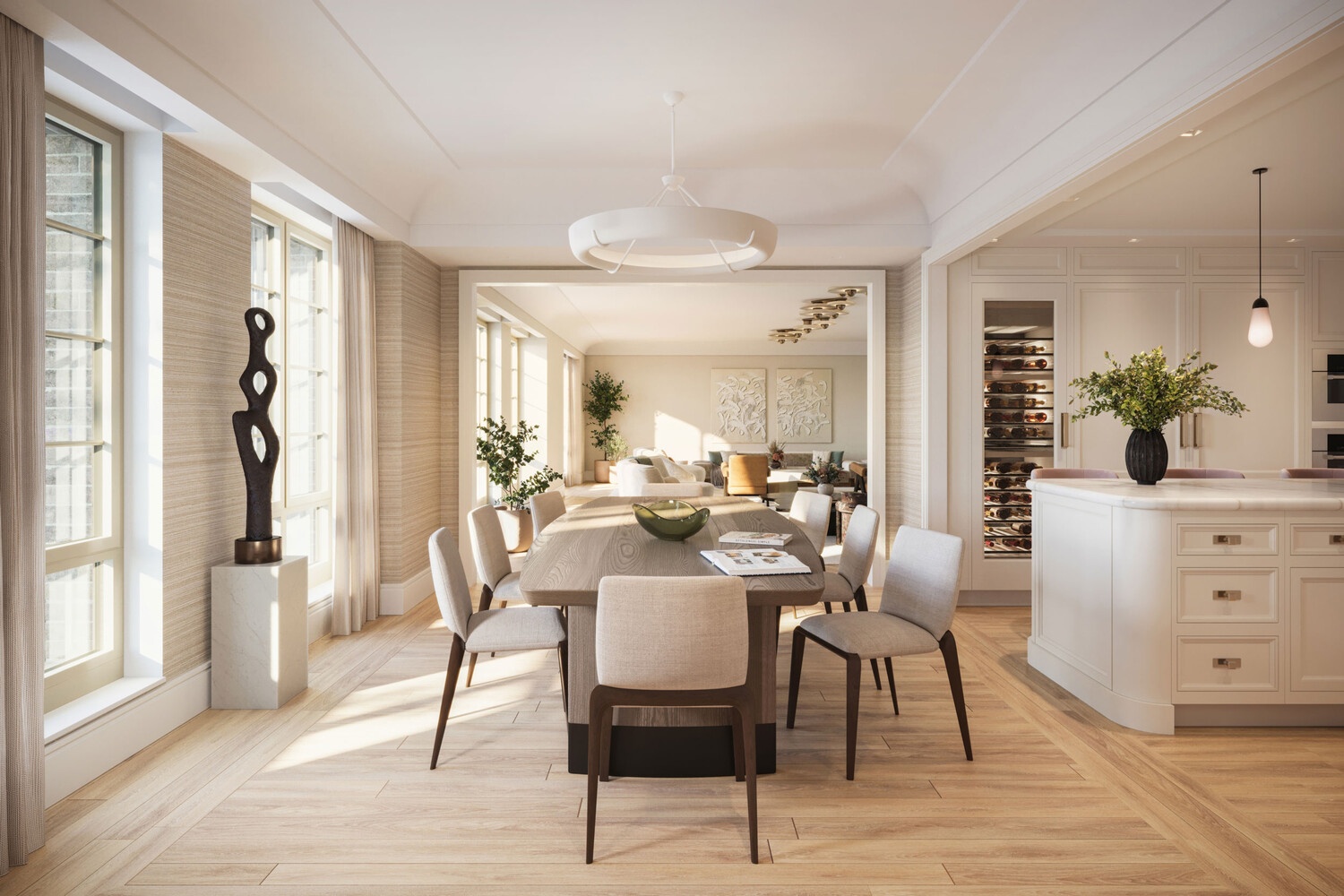 With nearly 50 feet of prime Fifth Avenue frontage, Residence No. 6 is a meticulously crafted four-bedroom, four-and-a-half-bath home that spans an entire floor. A private elevator opens into a gracious entry gallery, leading to a grand great room framed by 7'6" Wausau windows and French inswing doors, flooding the space with natural light.