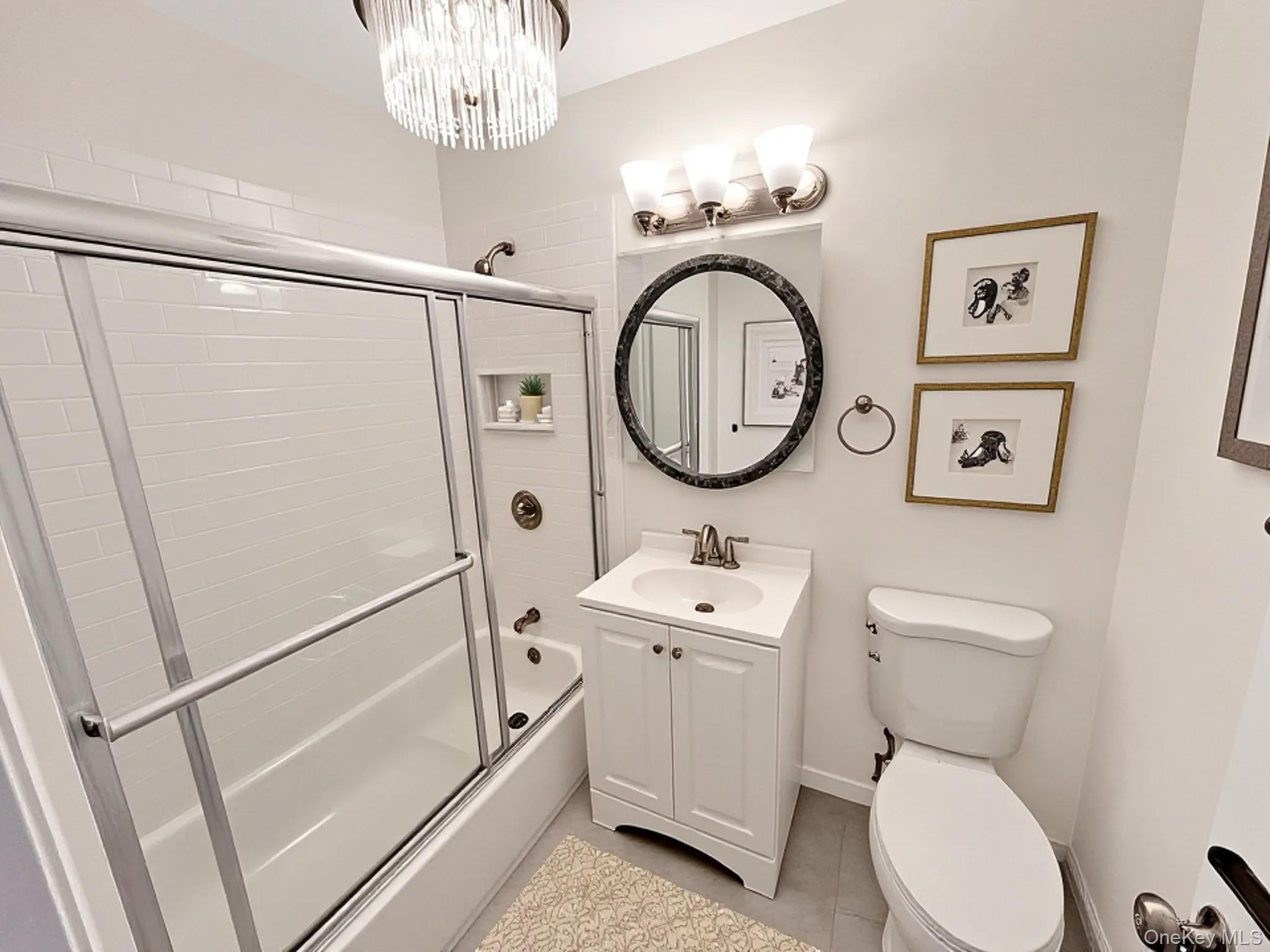 - Full bathroom with vanity, combined bath / shower with glass door, light tile patterned floors, and a chandelier