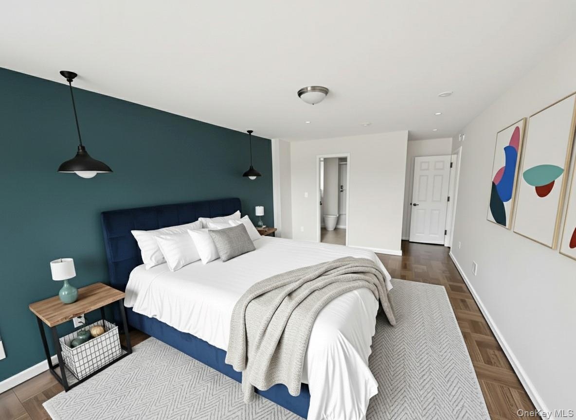 - Bedroom featuring radiator, a chandelier, a city view, wallpapered walls, and parquet floors