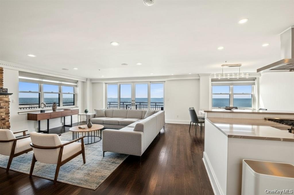 - Living room featuring dark wood-style flooring, recessed lighting, and a water view