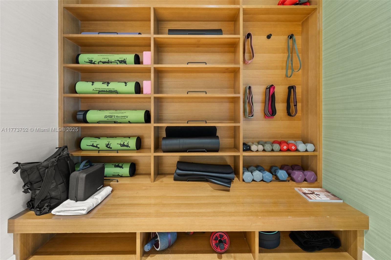 - Organized wall system stocked with mats, dumbbells, and resistance bands for customized workouts.