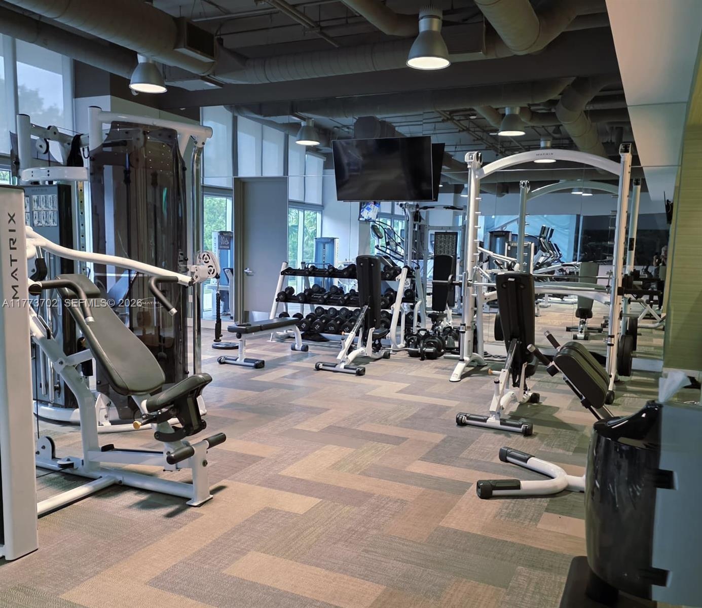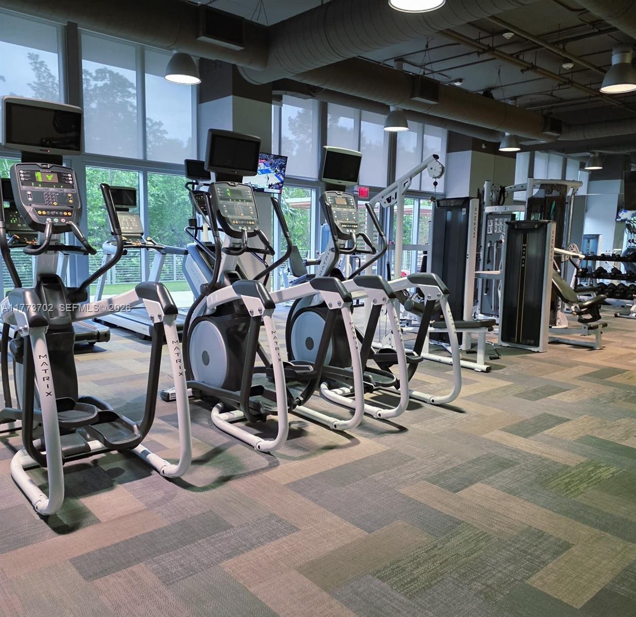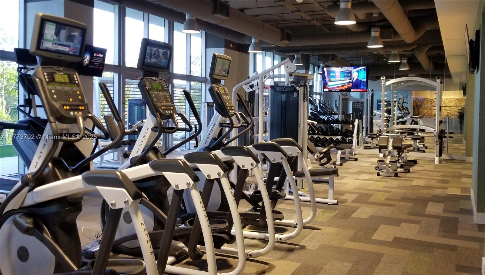 - Fully equipped gym with modern cardio machines and strength-training equipment, complemented by floor-to-ceiling windows for natural light.