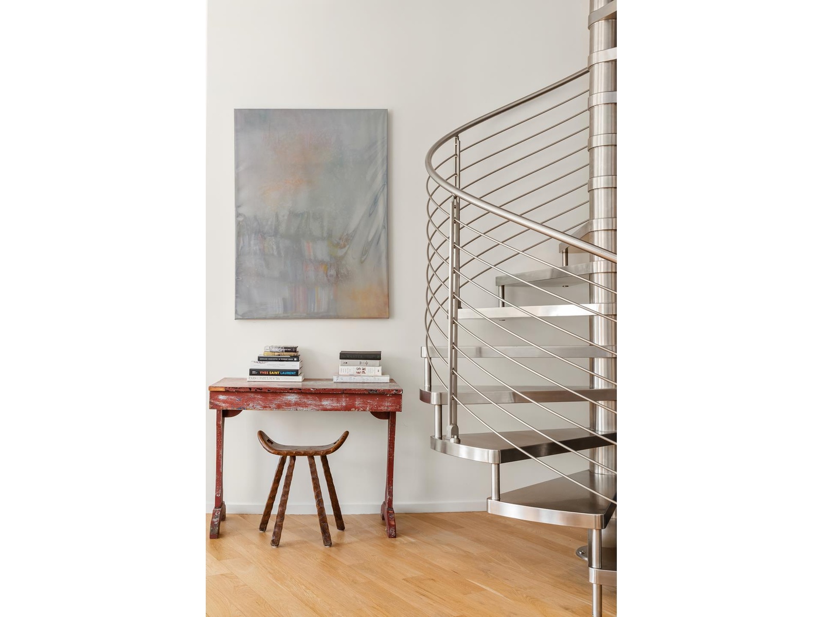 The layout is spacious, flexible, and thoughtfully designed - currently configured as a one-bedroom with two full baths, with the option to easily convert to a two-bedroom. A dramatic double-height entryway, anchored by a sculptural stainless steel staircase handcrafted in Italy, creates an unforgettable first impression. Upstairs, the expansive private roof terrace has been fully outfitted with landscaped planters, an automatic irrigation system, grill, stylish outdoor furniture, and outdoor electricity - offering a turnkey escape perfect for relaxing or entertaining.
