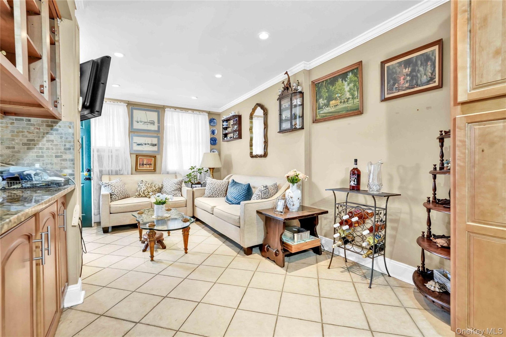 - Living area featuring crown molding, light tile patterned flooring, baseboards, and recessed lighting