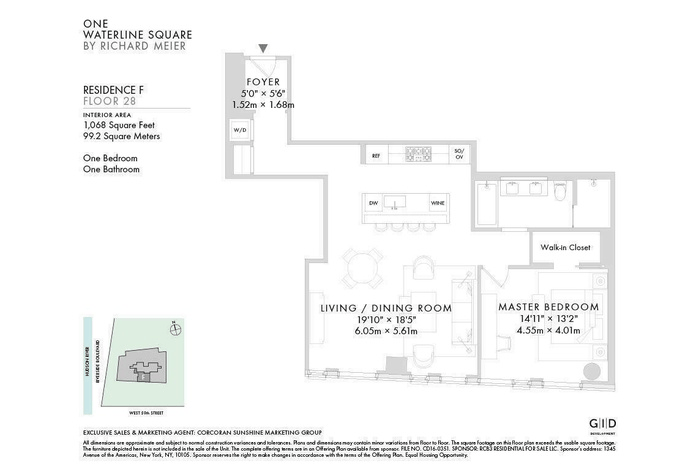 This 28th-floor one-bedroom apartment in the luxurious One Waterline Square condo at 10 Riverside Blvd. is available for rent. Its floor-to-ceiling south-facing windows offer grand NYC and Hudson River views and provide abundant sunlight in every room.