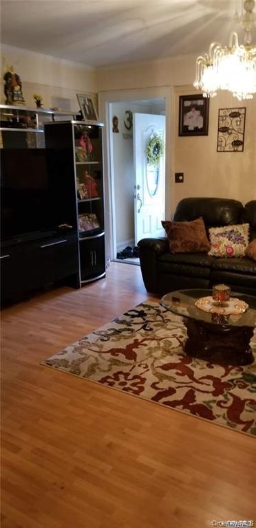 - Living area with a chandelier and wood finished floors