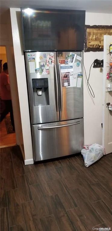 - Detailed view of stainless steel refrigerator with ice dispenser and dark wood-style floors