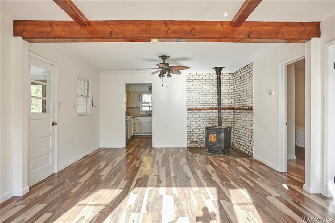 - Unfurnished living room with ceiling fan, dark hardwood / wood-style floors, beamed ceiling, and a wood stove