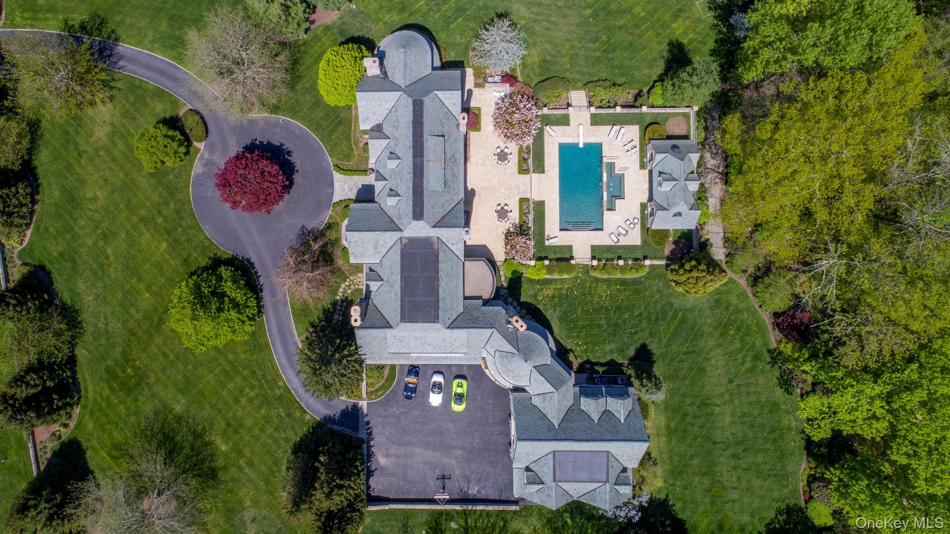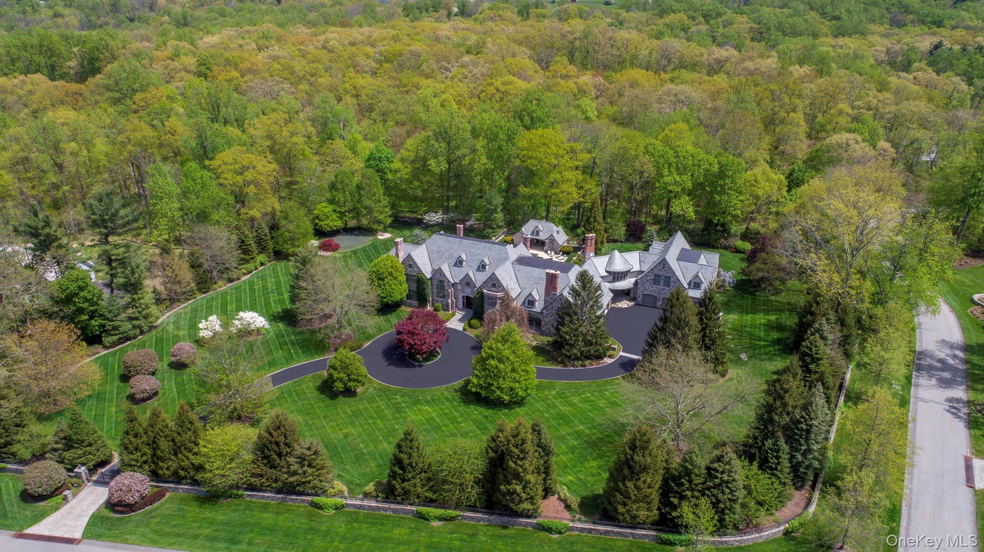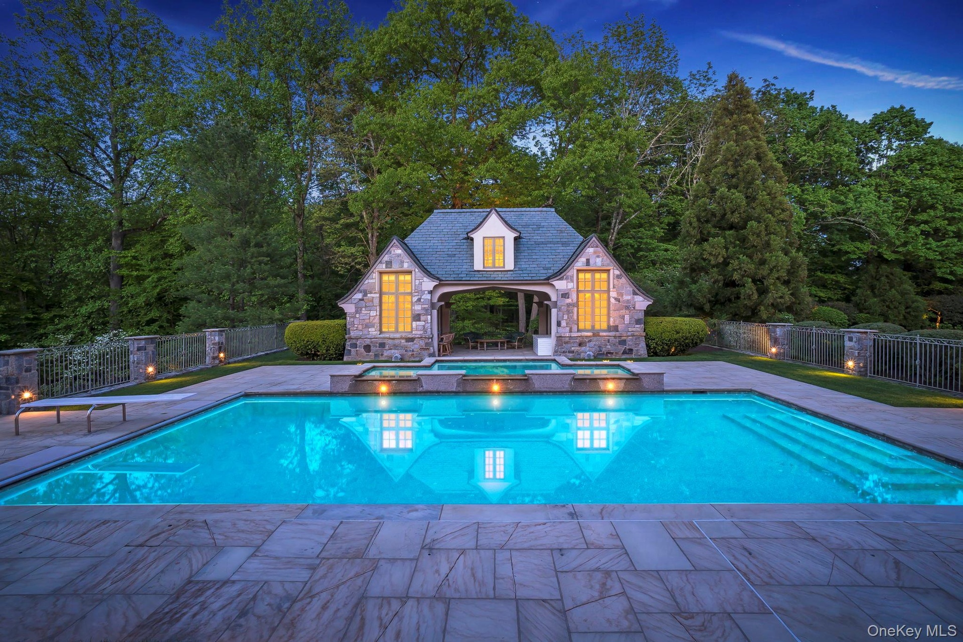 Behind the gates of one of Bedford's most exclusive enclaves, rises this breathtaking English Manor estate designed by renowned architect Tasos Kokoris. This architectural gem offers unparalleled privacy, luxurious resort-style amenities, and a coveted location - just under an hour from Manhattan. Set on over five acres of flawlessly landscaped grounds, the home is a statement of timeless sophistication and superior craftsmanship. Inside, soaring 10 to 12-foot ceilings, intricate custom millwork, and designer finishes create a sense of grandeur. A new Deane kitchen anchors the heart of the home, while thoughtful additions such as an elevator, full gym, sauna, wine cellar, theater, and guest suite enhance its lifestyle offerings. A cherry-paneled library hides a dramatic stairway leading to a magnificent primary suite, complete with dual spa bathrooms, expansive walk-in closets, and a serene, glass-wrapped sitting room. Perfectly tailored for both large-scale entertaining and quiet moments, the outdoor living spaces feature a heated 40x20 PebbleTec saltwater pool, 14-person infinity-edge spa, and a luxurious pool cabana with a summer kitchen and full amenities. Enjoy a three-season screened porch, limestone terrace, lush gardens, and even your own private golf practice area. A showroom-style garage for nine cars complements the main residence's attached garage and is perfectly tailored for a luxury car collection or other uses such as an indoor sport court. Easy access to award-winning schools, top country clubs, fine dining, shopping, and Westchester County Airport. This is the pinnacle of luxury living in Bedford.