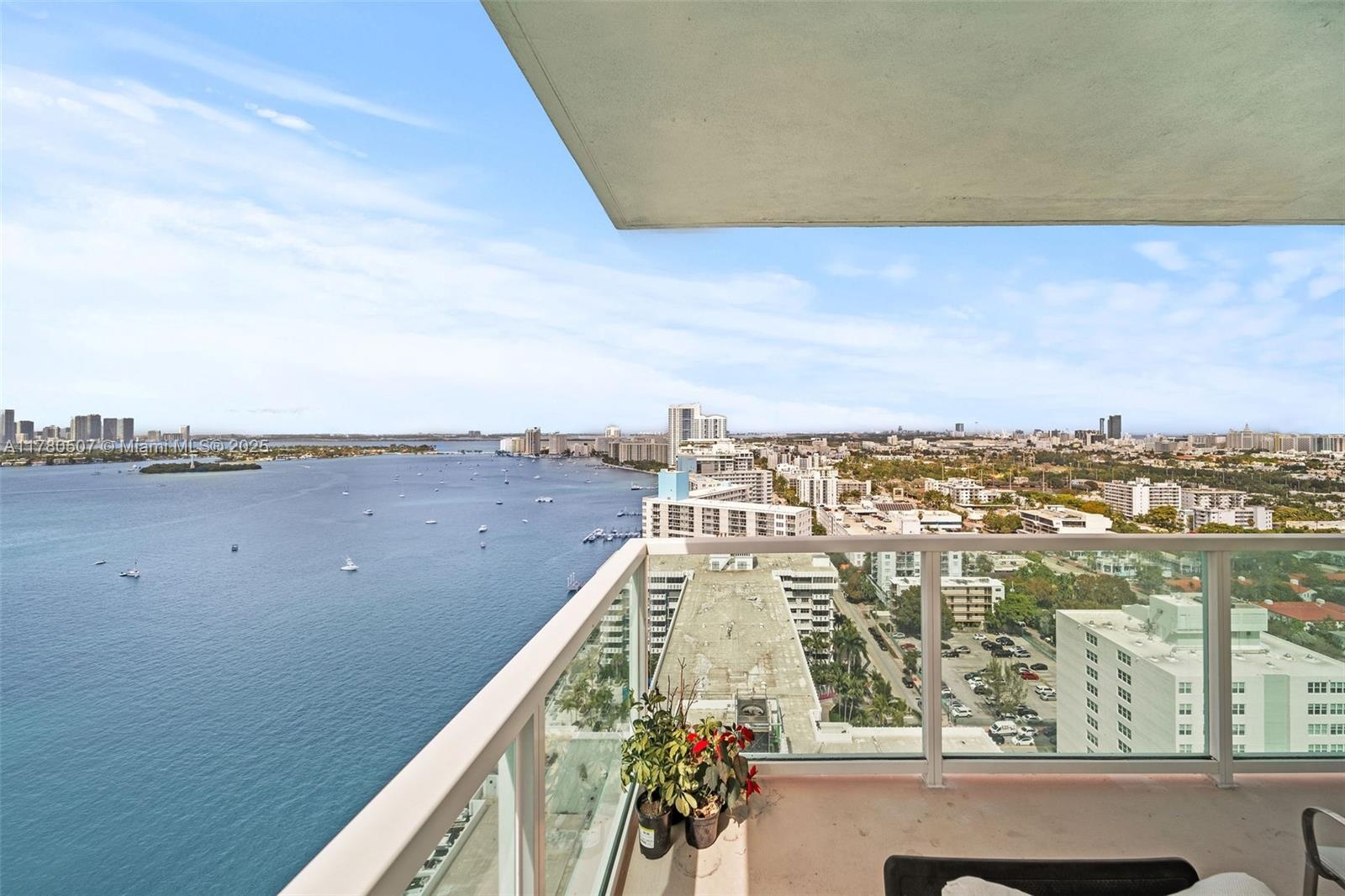 Premier corner line at The Floridian with a wraparound balcony and stunning views of Biscayne Bay, Star and Palm Islands, and the Downtown Miami skyline.