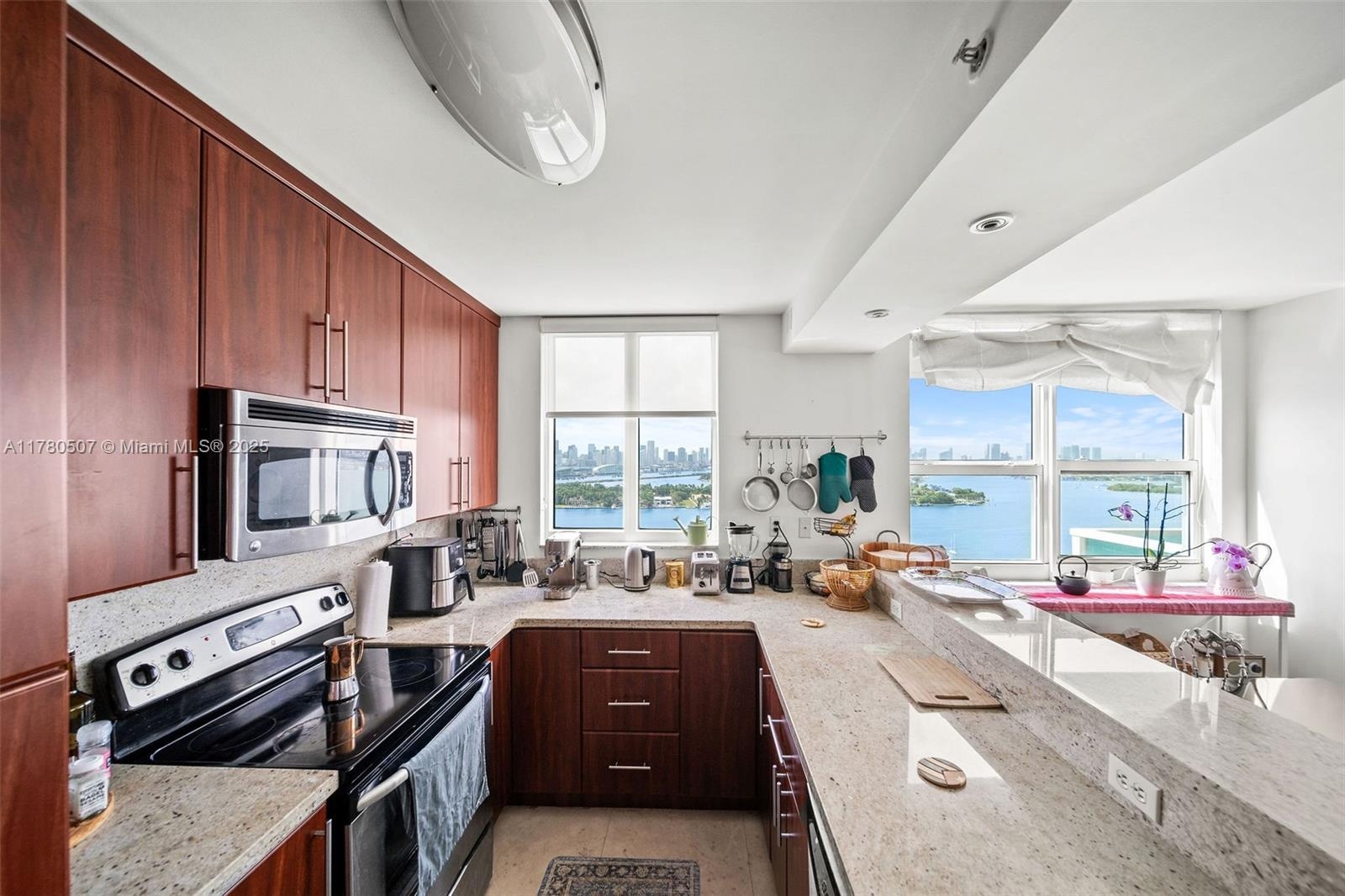 Premier corner line at The Floridian with a wraparound balcony and stunning views of Biscayne Bay, Star and Palm Islands, and the Downtown Miami skyline. This spacious 2-bedroom, 2-bath residence features a split floor plan, marble floors, an open kitchen with stainless steel appliances, updated closets, and an in-unit washer and dryer. Includes assigned garage parking. The Floridian offers resort-style amenities including two bayfront pools, a fitness center, hot tub, tennis court, 24-hour security, concierge, and valet service.