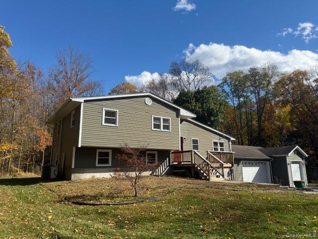 - Tri-level home with a front yard, stairway, a deck, and an attached garage