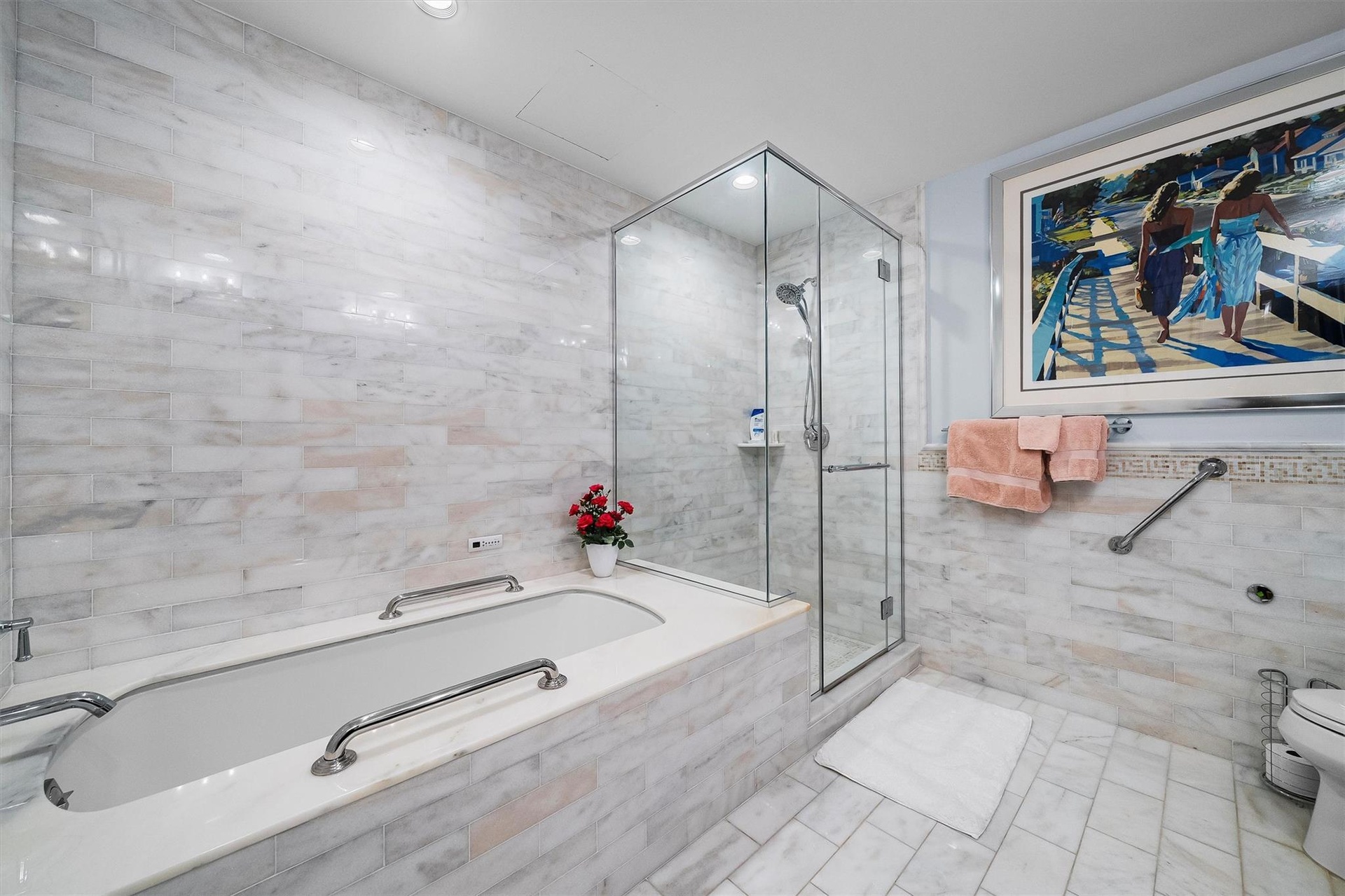 - Full bathroom featuring a shower stall, tile walls, a garden tub, and toilet