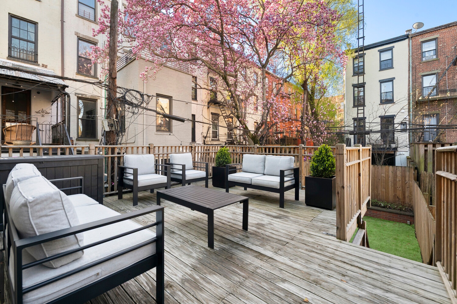 The parlor level features soaring ceilings, pristine pinewood floors, and stunning original glass-inset pocket doors. A renovated eat-in kitchen with Caesarstone counters and stainless-steel appliances opens to a large deck and lush, low-maintenance backyard, ideal for entertaining or quiet relaxation.